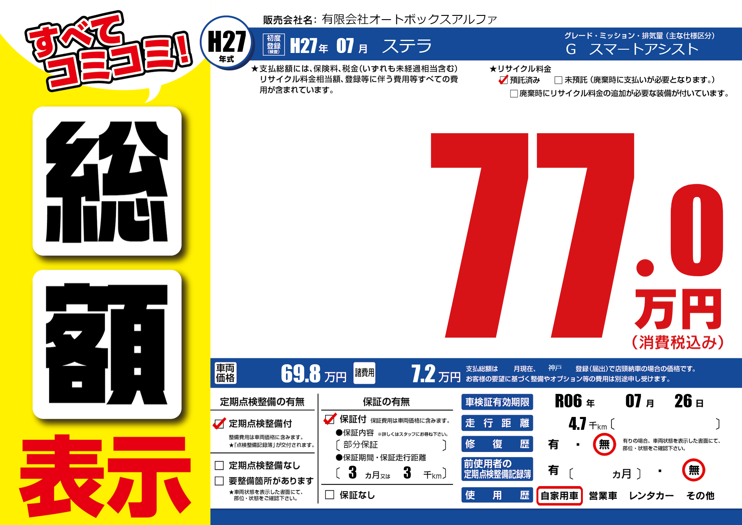| 車名 | ステラ | グレード ミッション 排気量 |