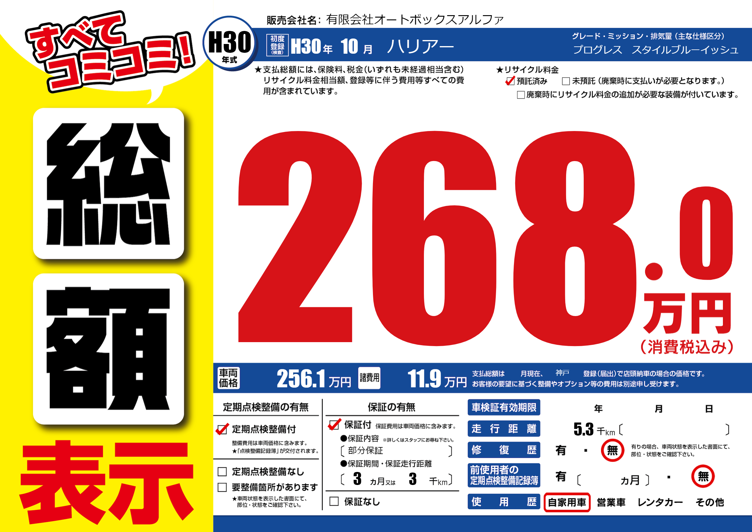 | 走行キロ | 0.5万km | 初年度登録 | H30年10月 |