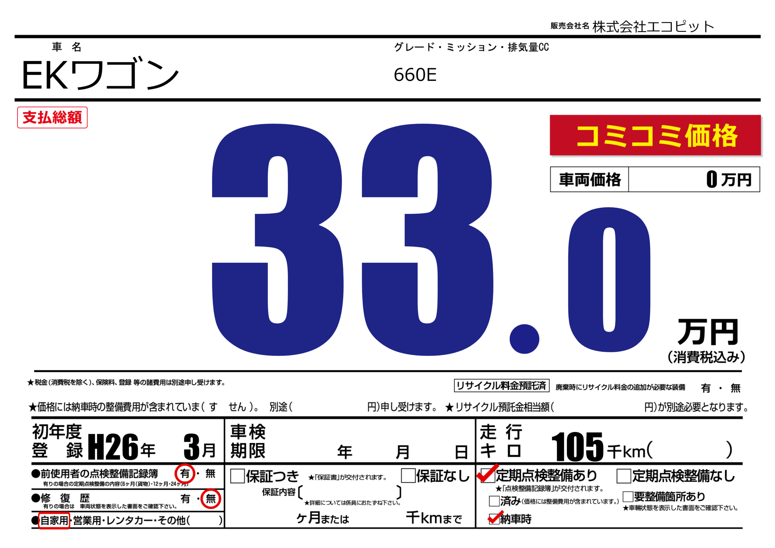 | 車名 | EKワゴン | グレード ミッション 排気量 |