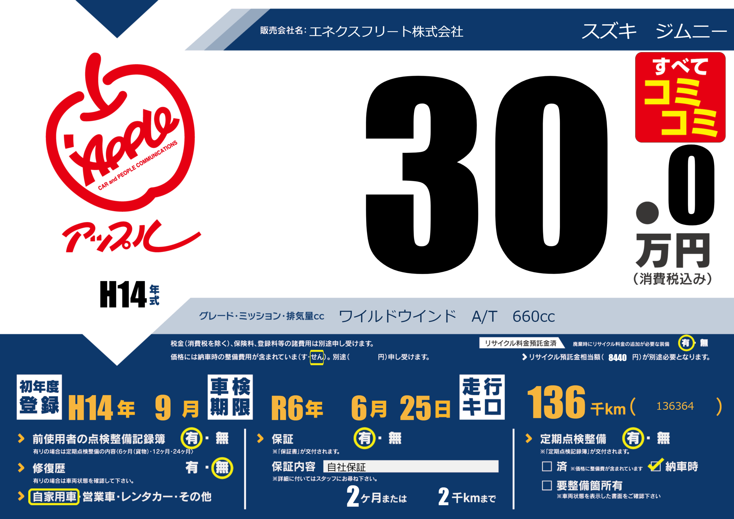| 走行キロ | 13.6万km | 初年度登録 | H14年9月 |