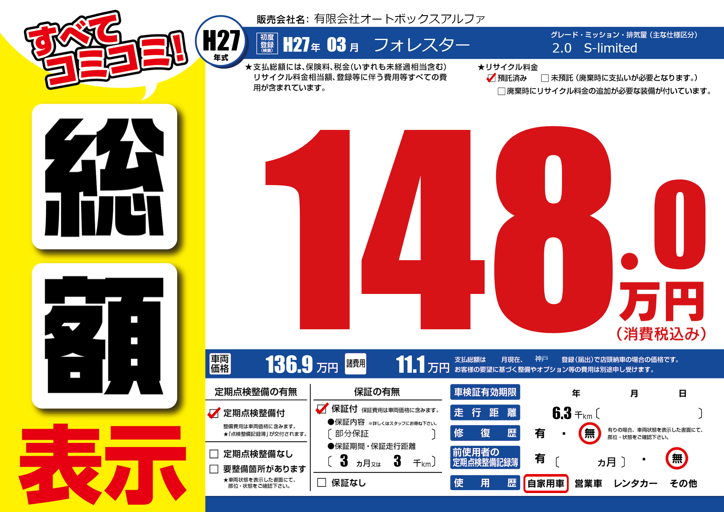 | 車名 | フォレスター | グレード ミッション 排気量 |