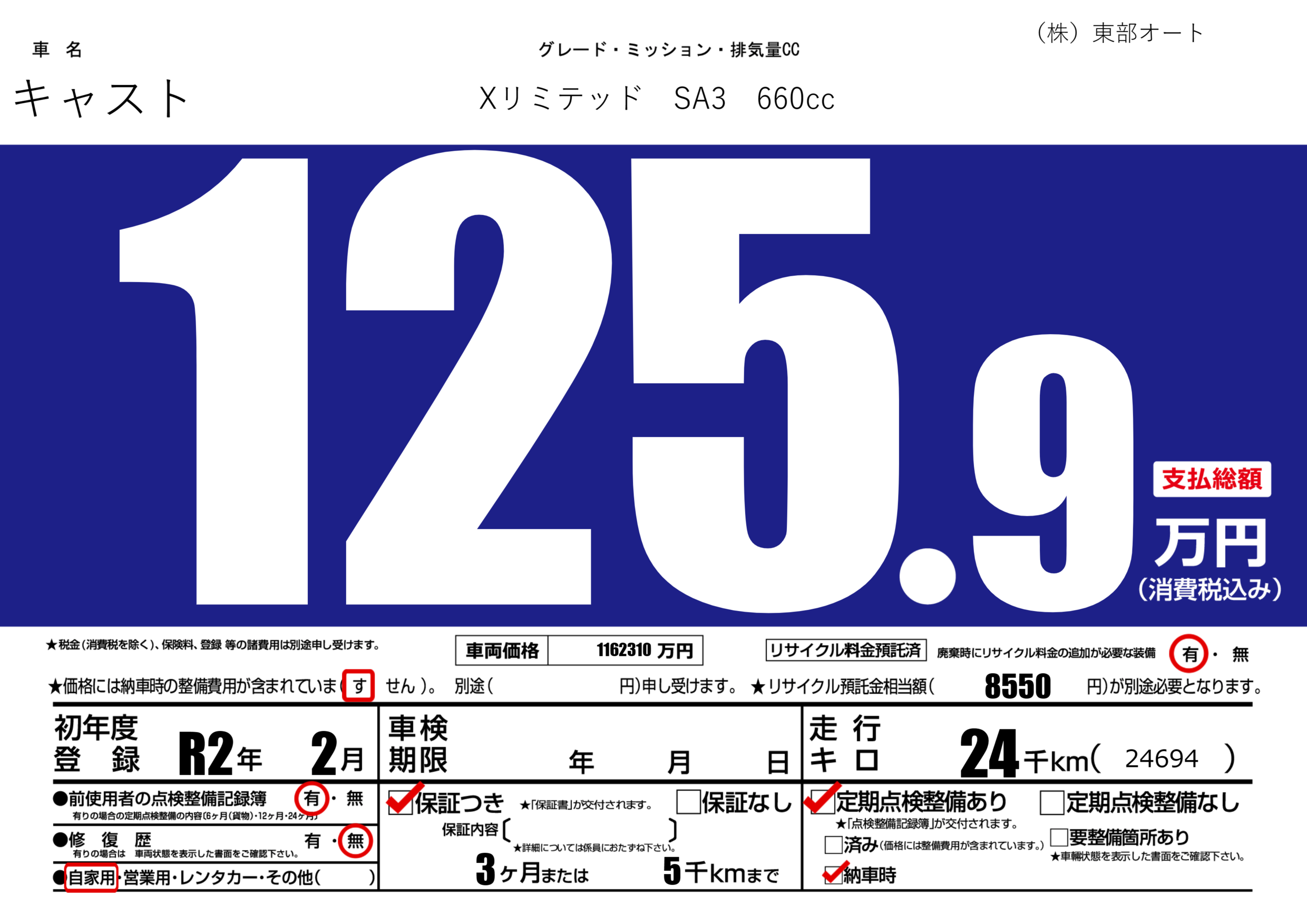 | 定期点検整備 | 定期点検整備あり 納車時あり | ||