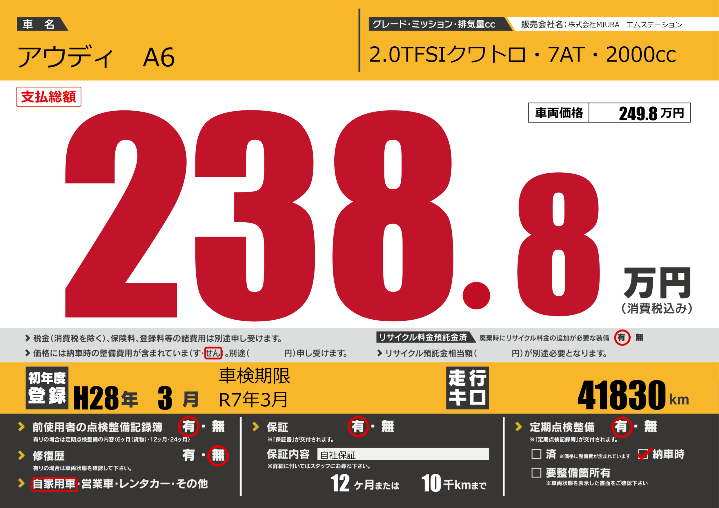 | 車名 | アウディ A6 | グレード ミッション 排気量 |