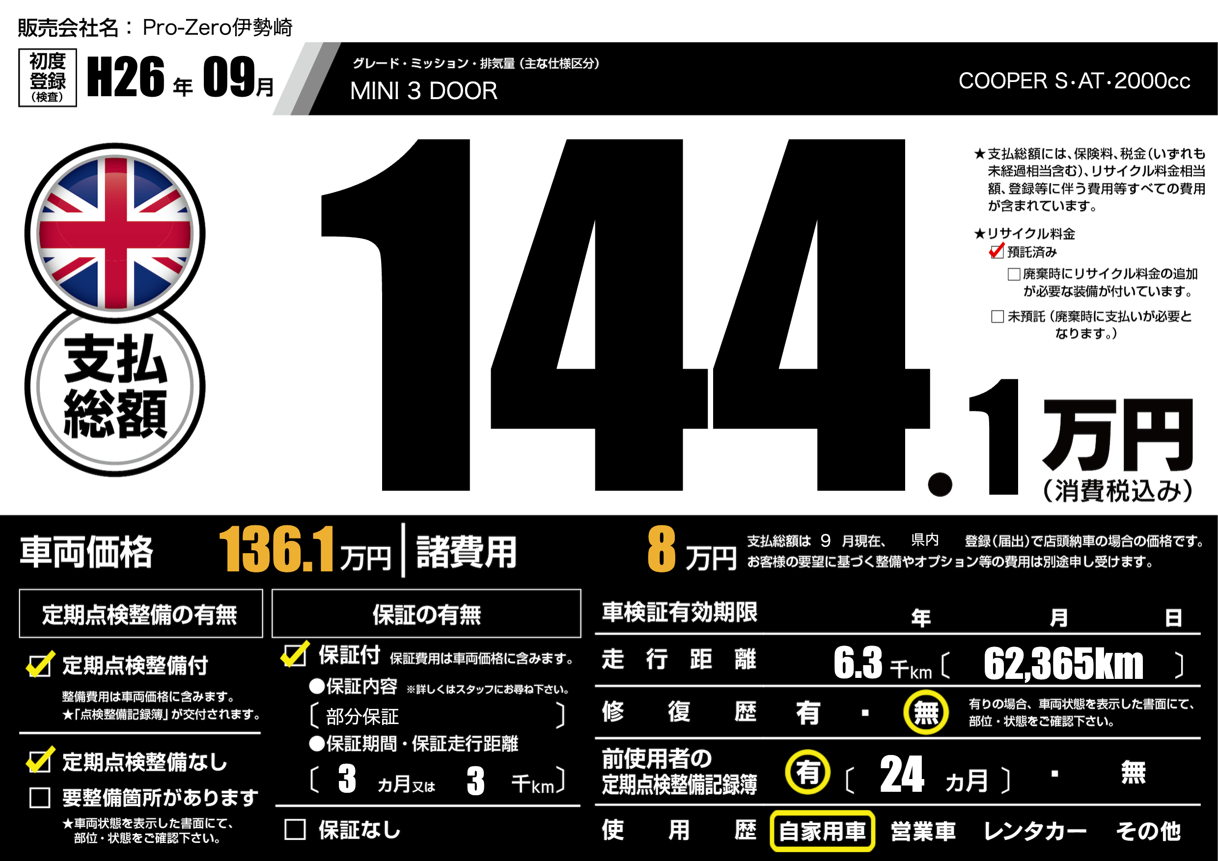 | 車名 | COOPER S•AT•2000cc | グレード ミッション 排気量 |