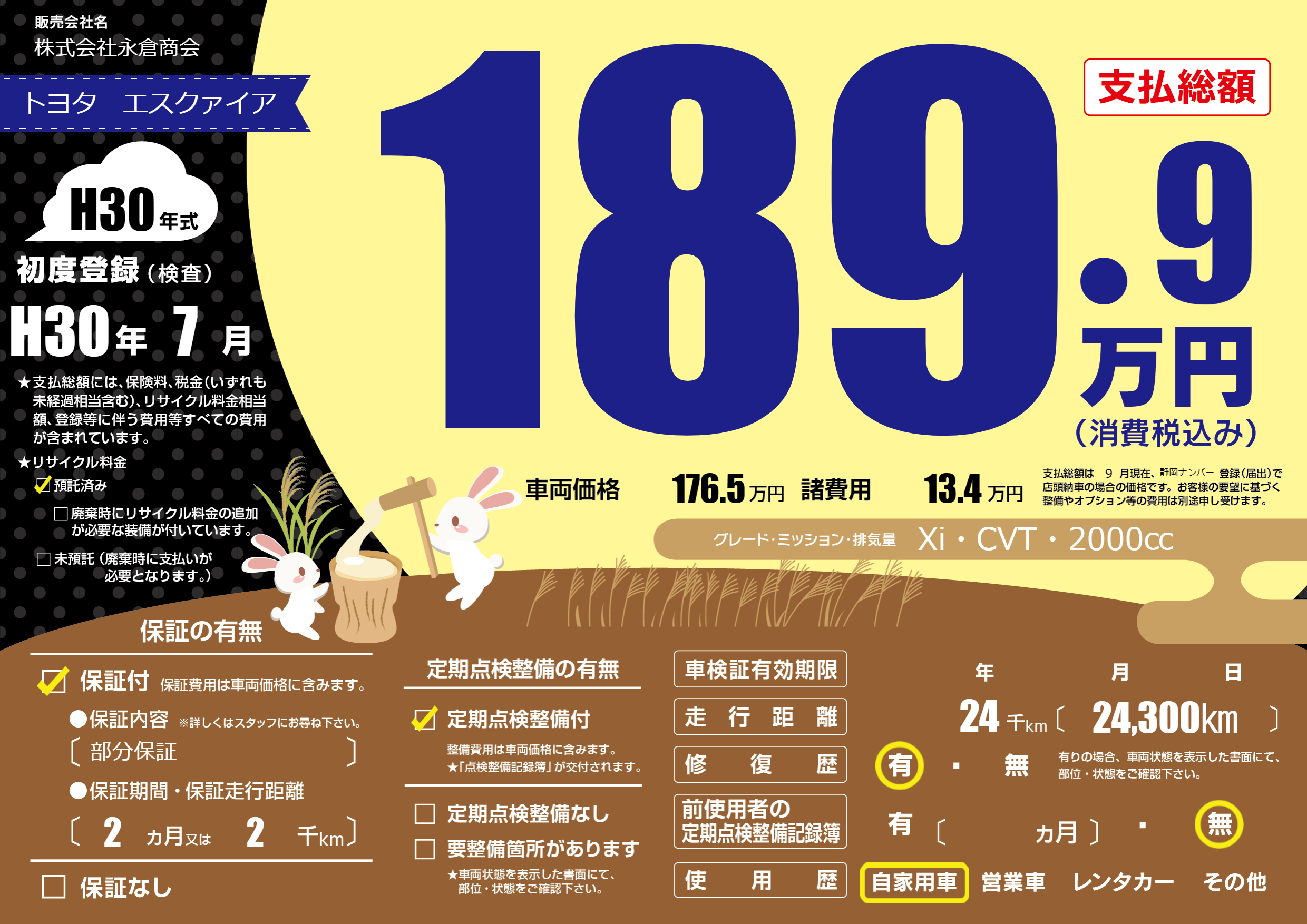 | 走行キロ | 2.4万km | 初年度登録 | H30年7月 |