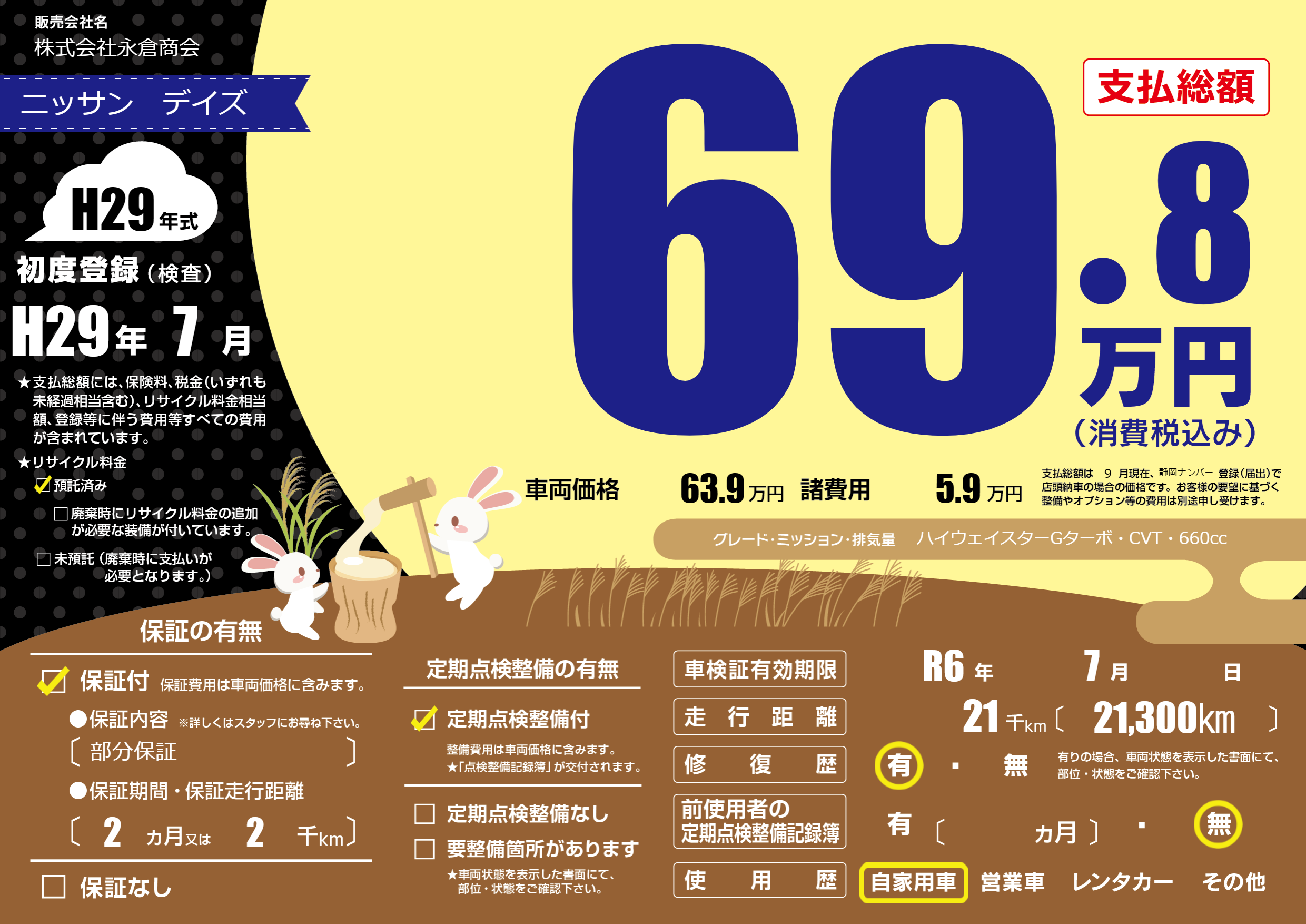 | 車名 | ニッサン デイズ | グレード ミッション 排気量 |