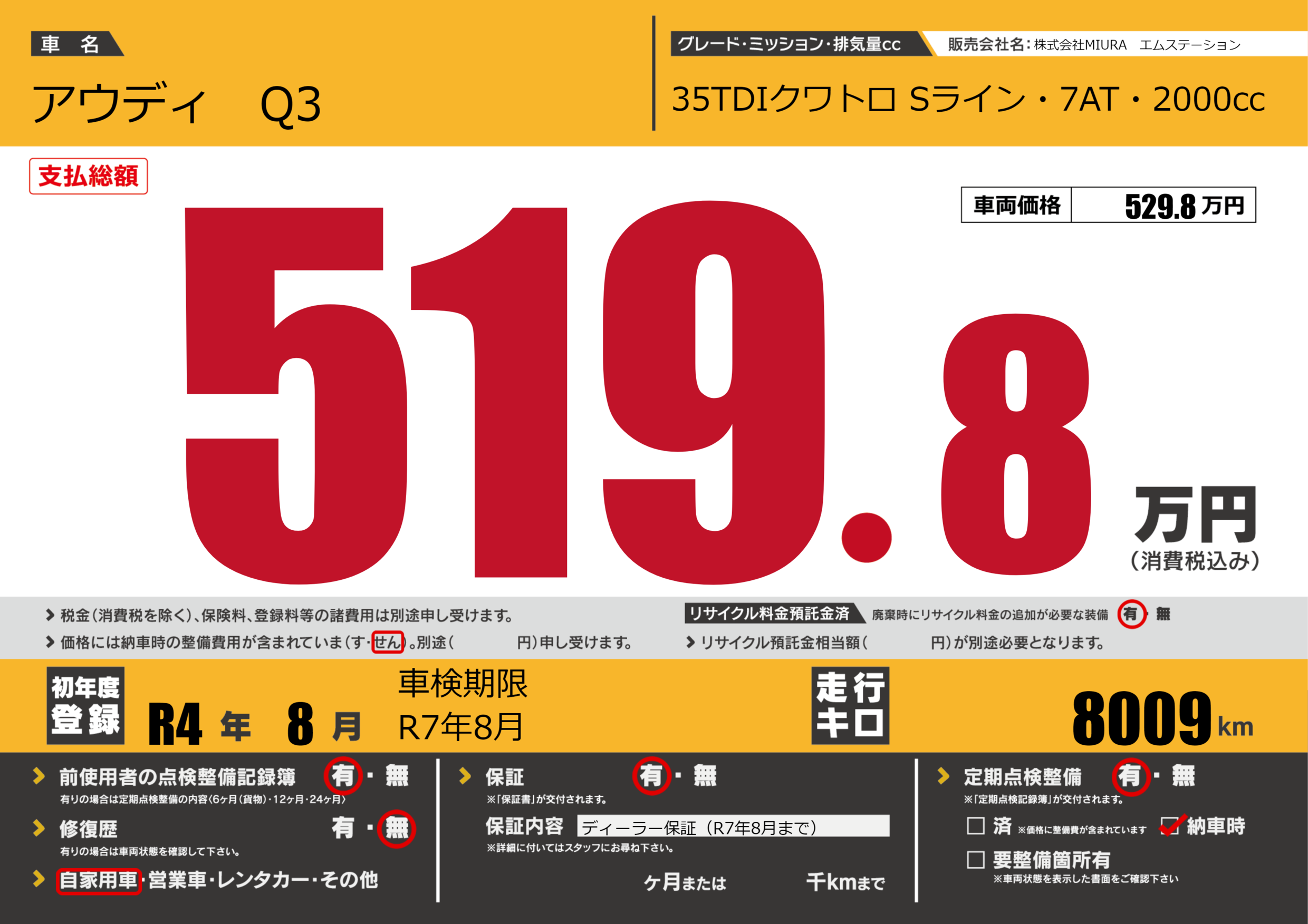 | 走行キロ | 800.9万km | 初年度登録 | R4年8月 |