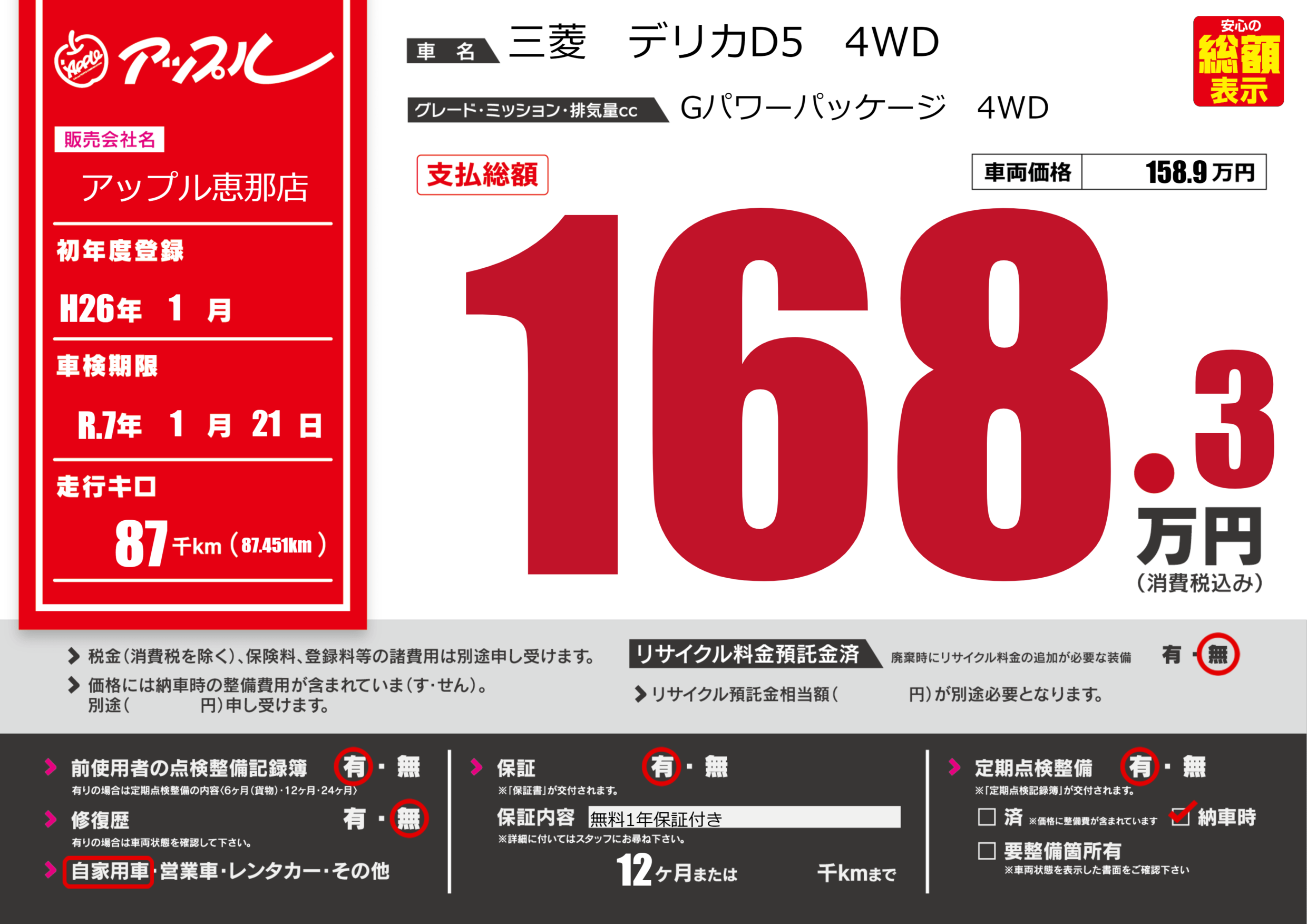 | 定期点検整備 | 定期点検整備あり 納車時あり | ||