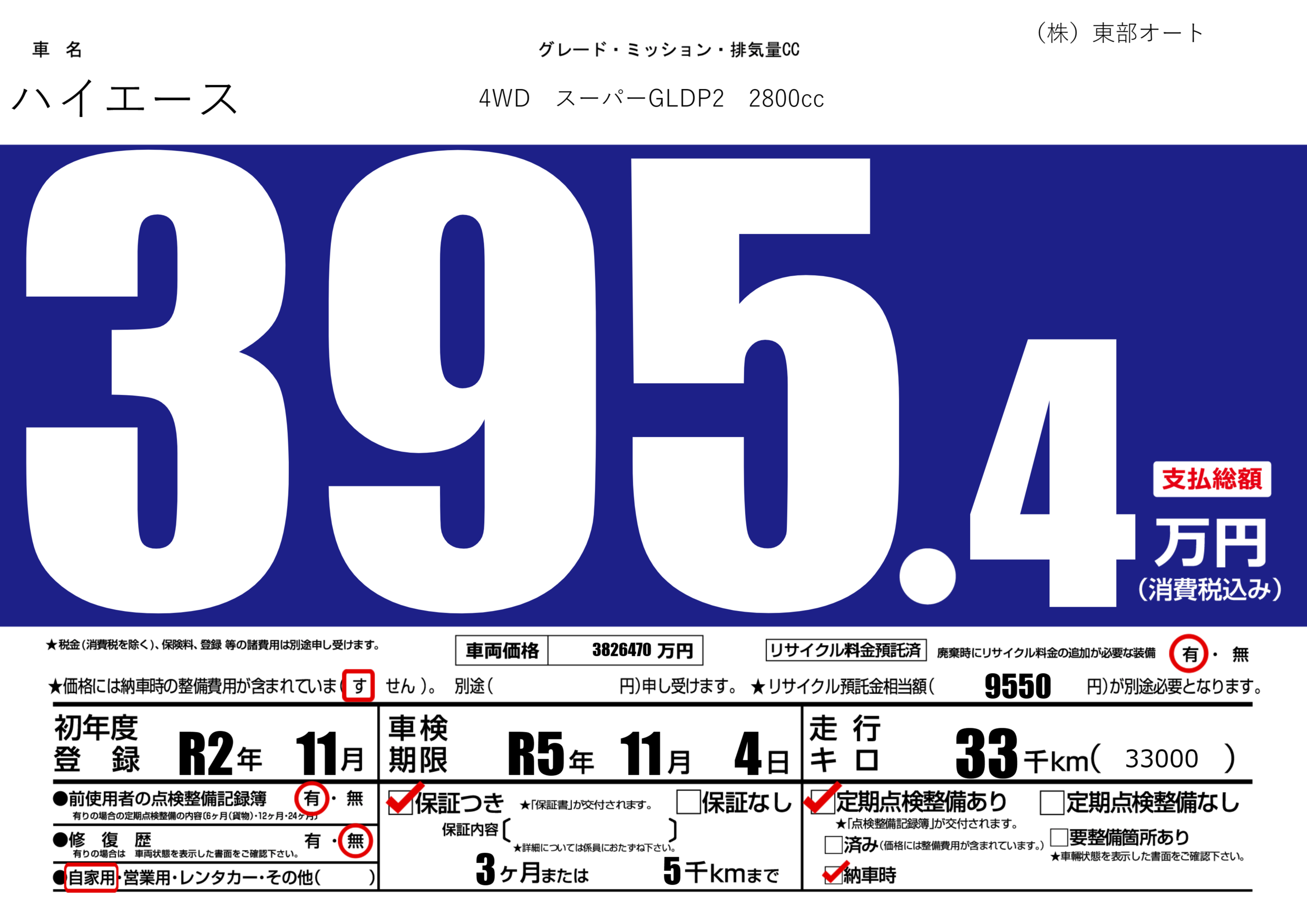 | 車名 | ハイエース | グレード ミッション 排気量 |