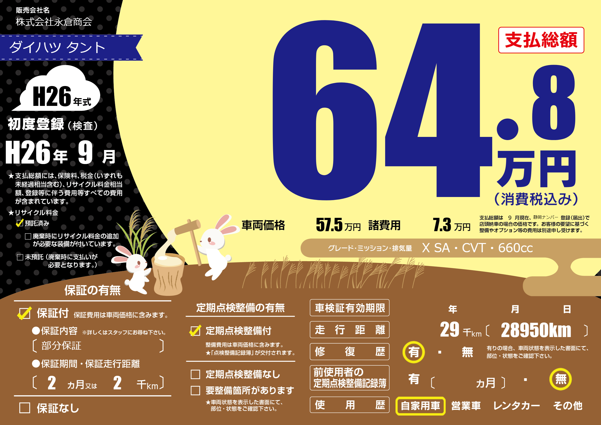 | 車名 | ダイハツ タント | グレード ミッション 排気量 |