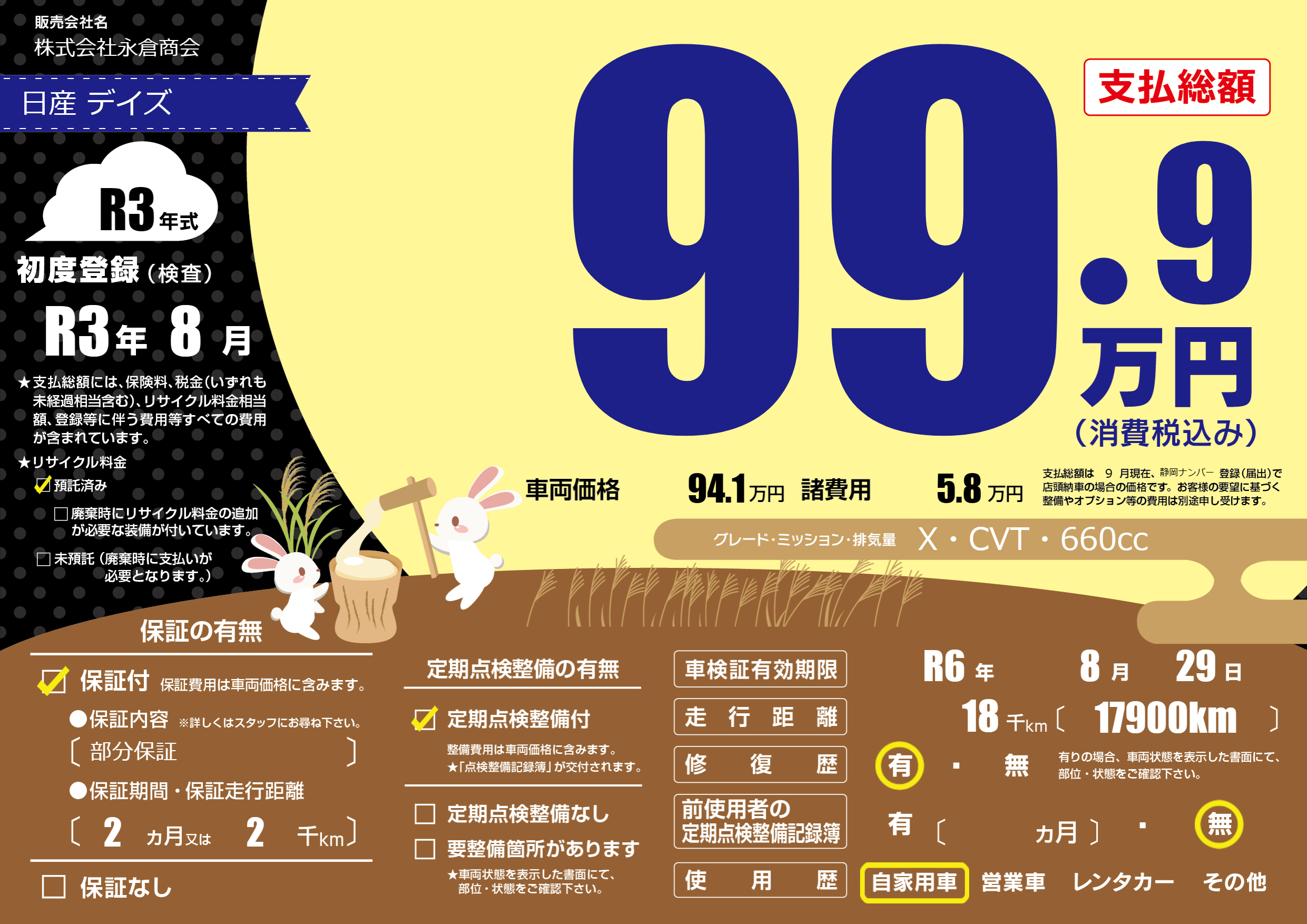 | 車名 | 日産 デイズ | グレード ミッション 排気量 |