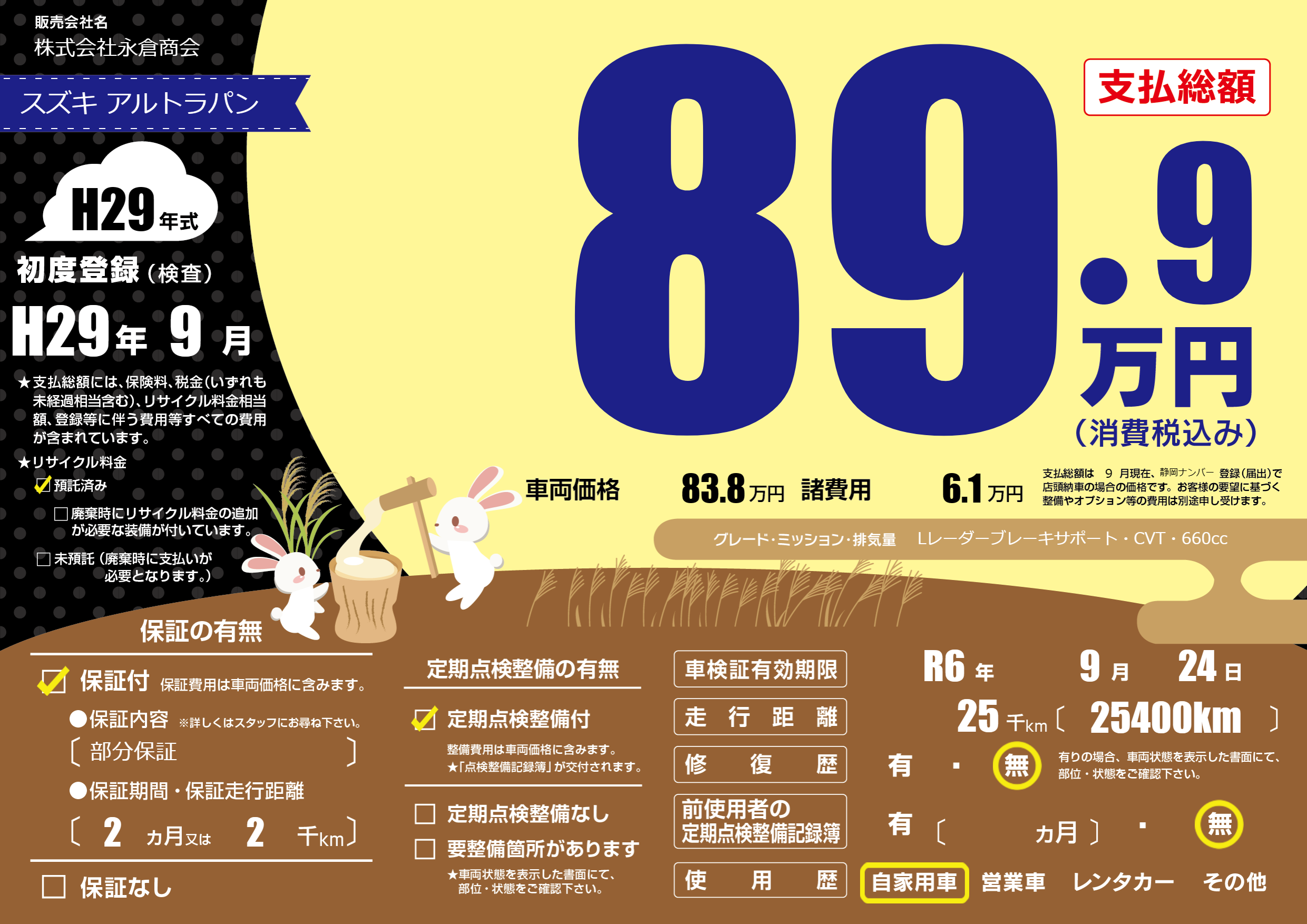 | 走行キロ | 2.5万km | 初年度登録 | H29年9月 |