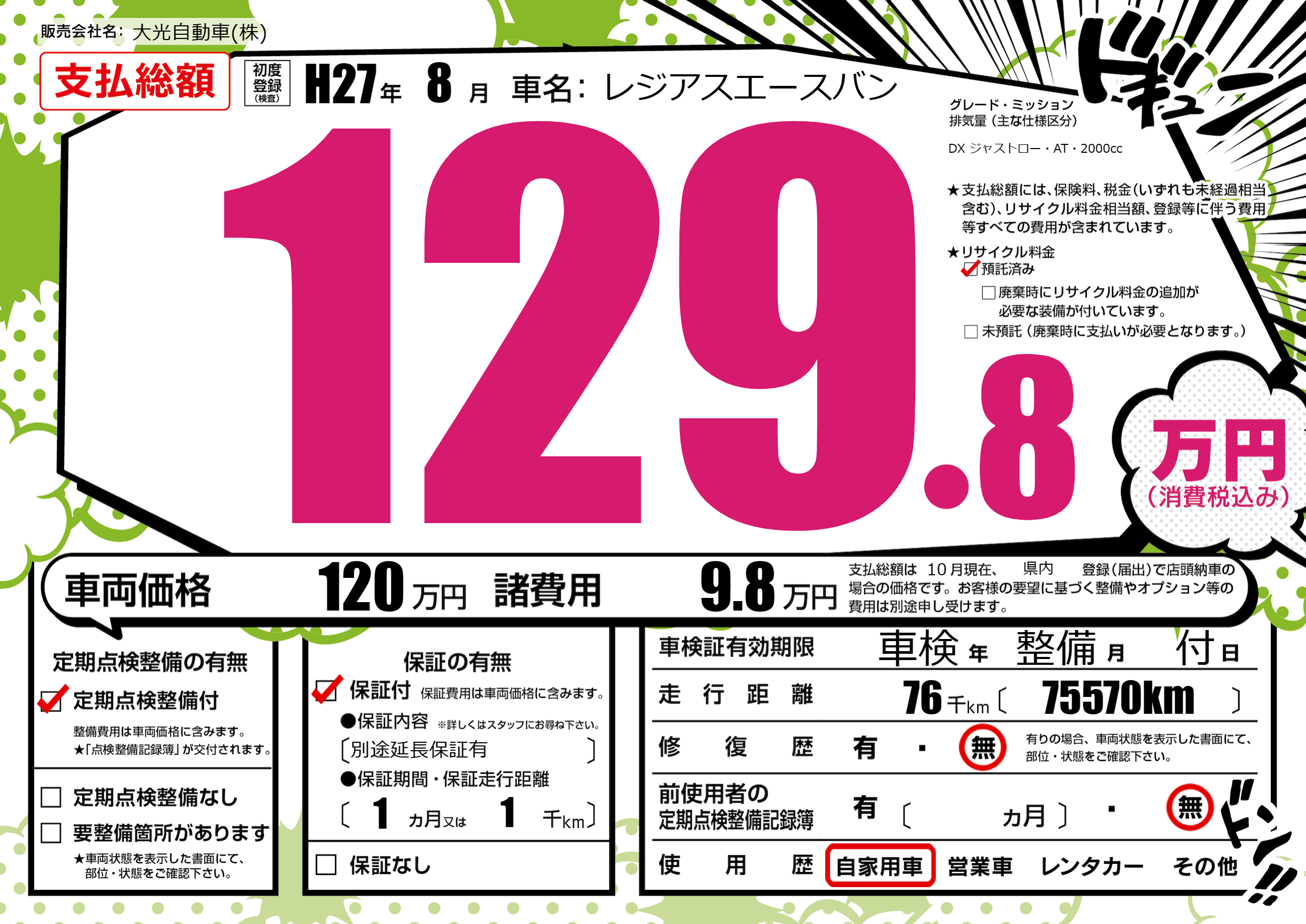 | 走行キロ | 7.6万km | 初年度登録 | H27年8月 |