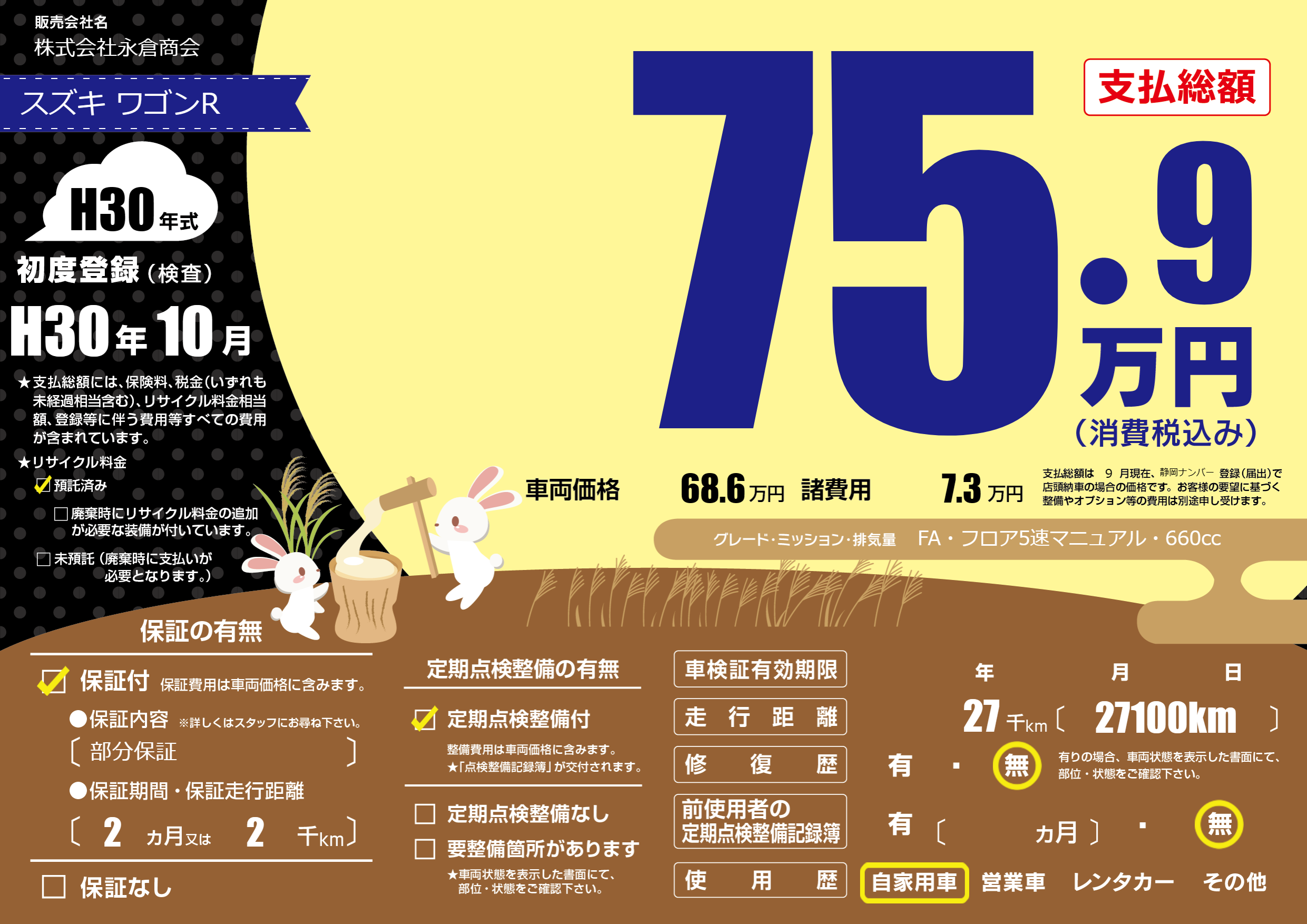 | 走行キロ | 2.7万km | 初年度登録 | H30年10月 |