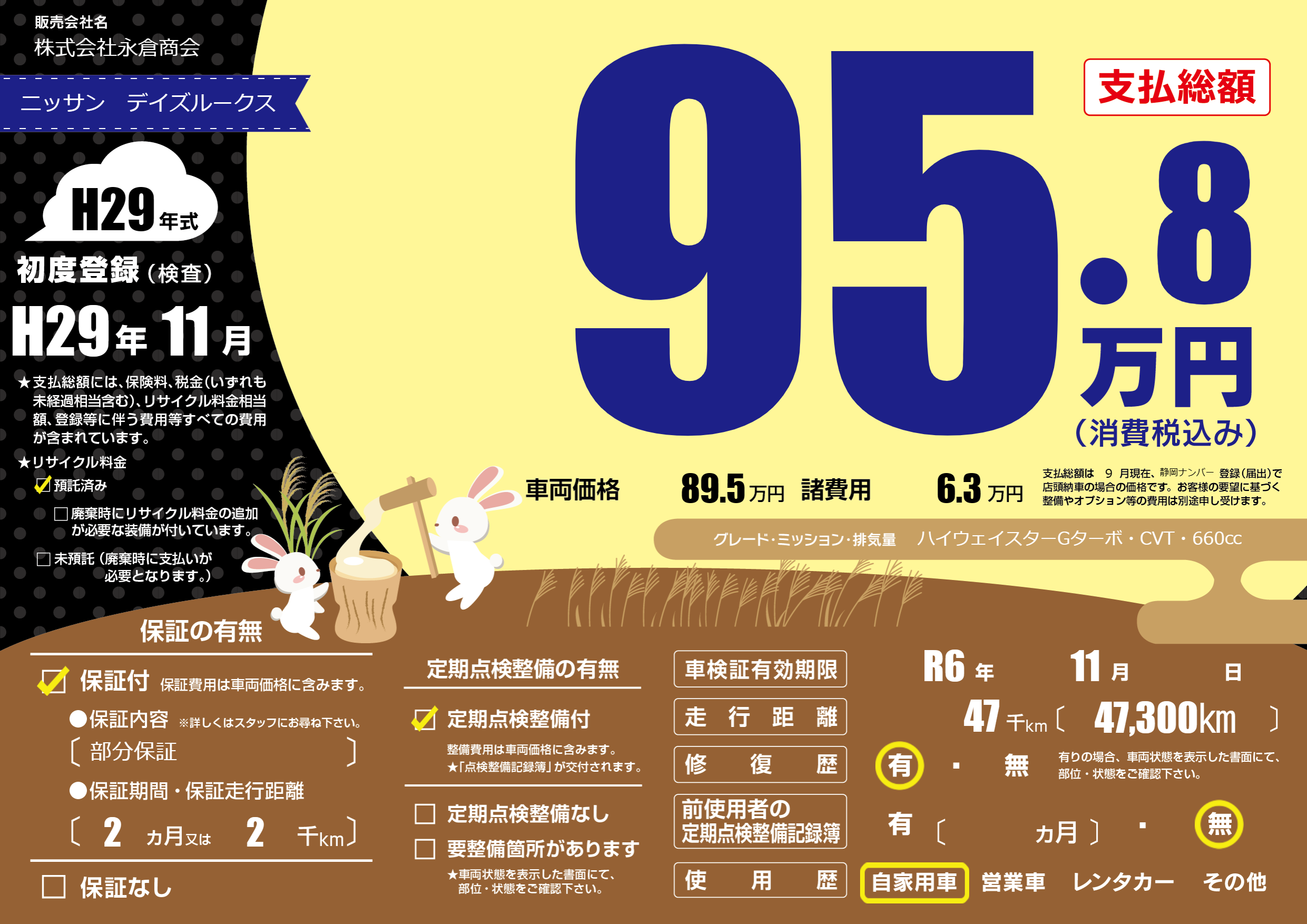 | 車名 | ニッサン デイズルークス | グレード ミッション 排気量 |