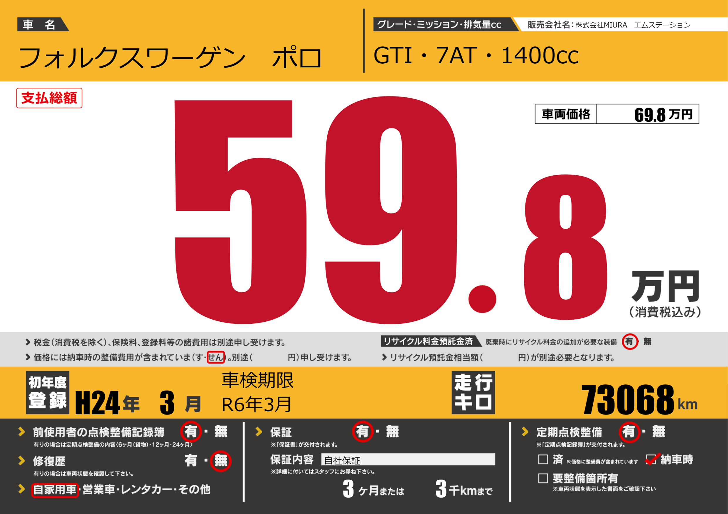 | 車名 | フォルクスワーゲン ポロ | グレード ミッション 排気量 |