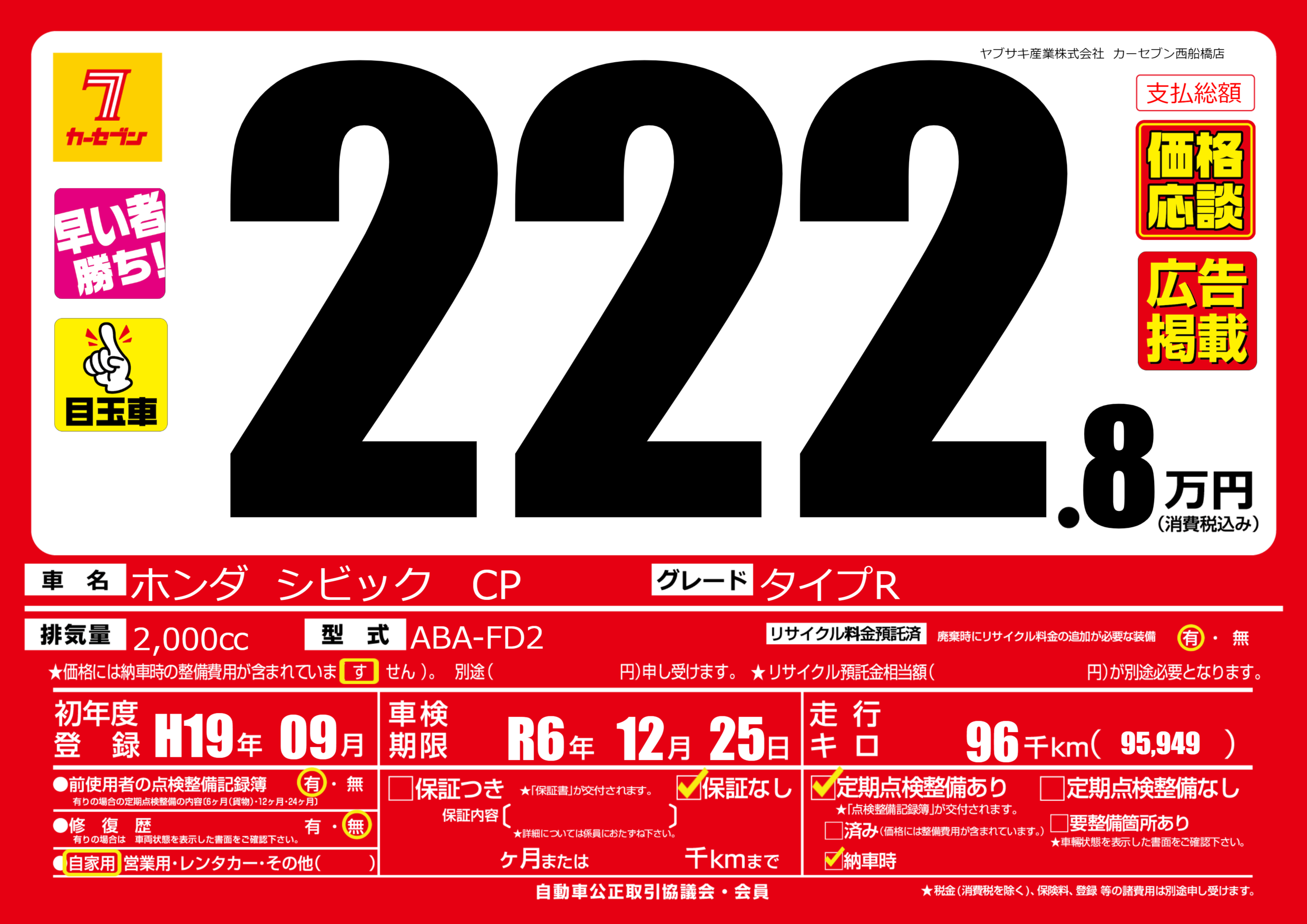 | 走行キロ | 9.6万km | 初年度登録 | H19年09月 |