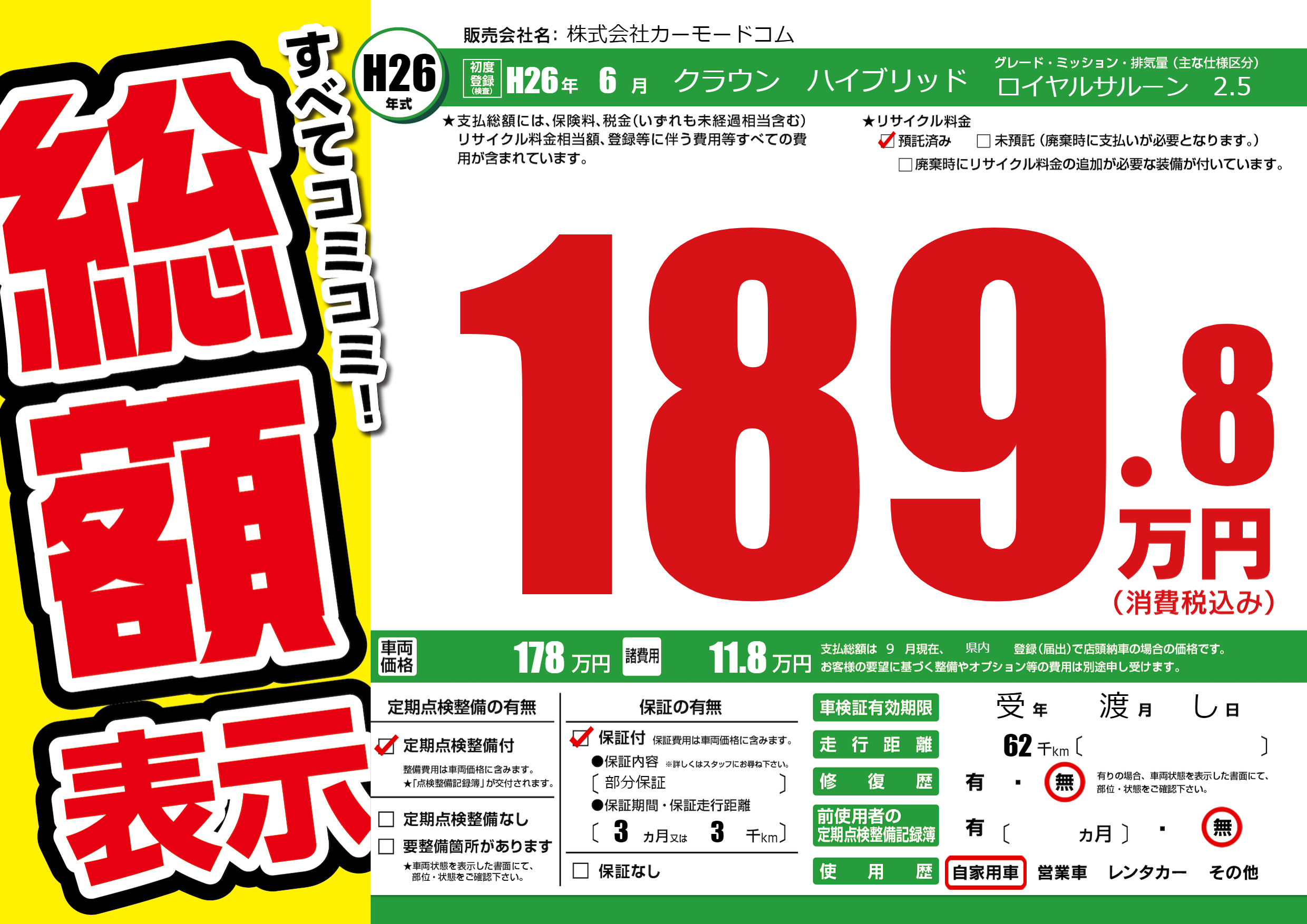 | 車名 | クラウン ハイブリッド | グレード ミッション 排気量 |