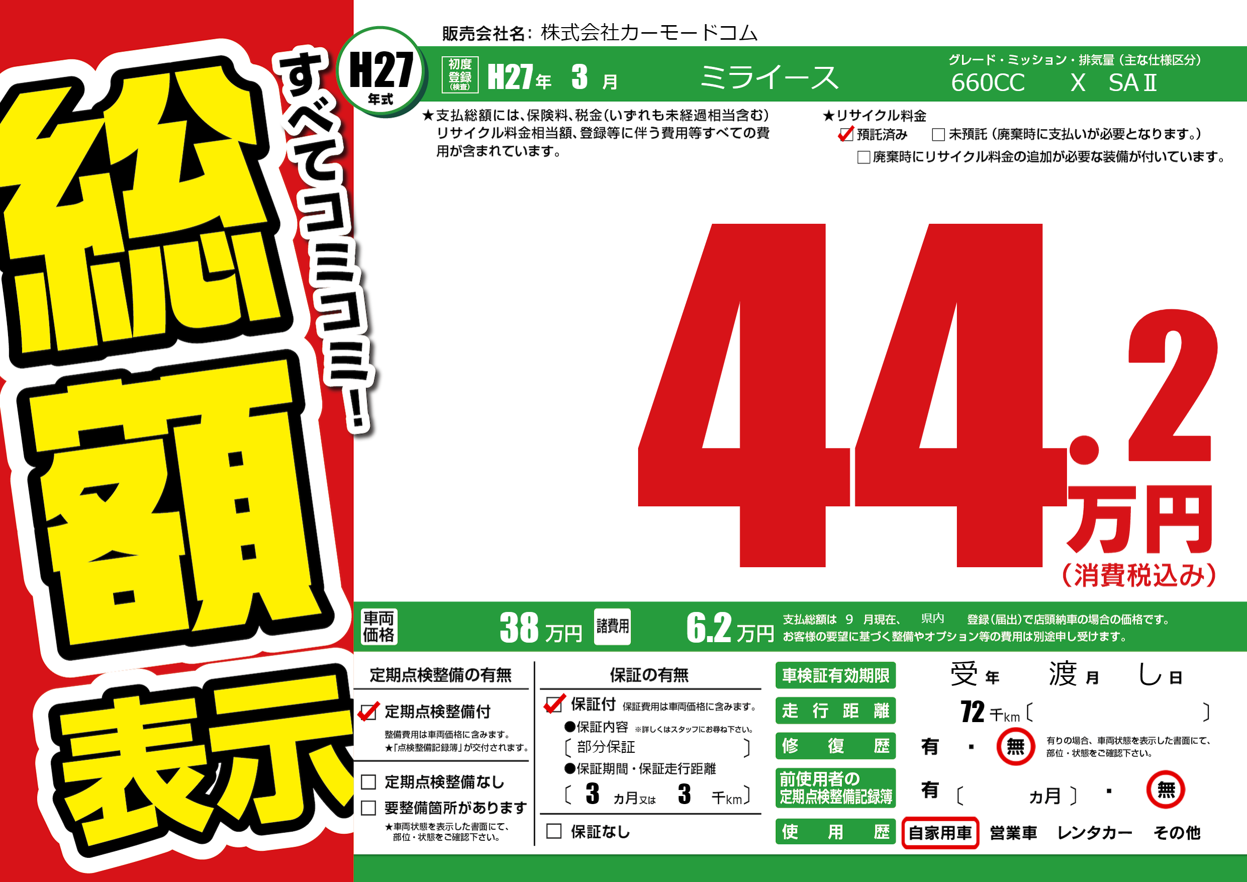 | 車名 | ミライース | グレード ミッション 排気量 |