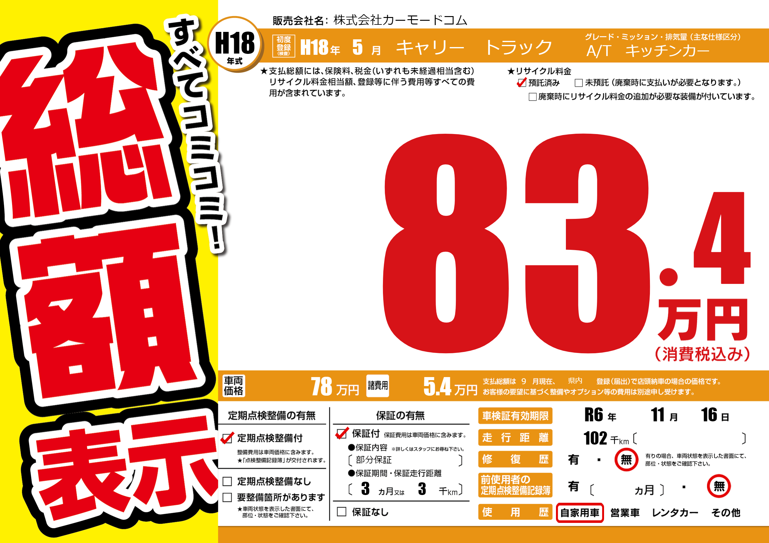| 車名 | キャリー トラック | グレード ミッション 排気量 |