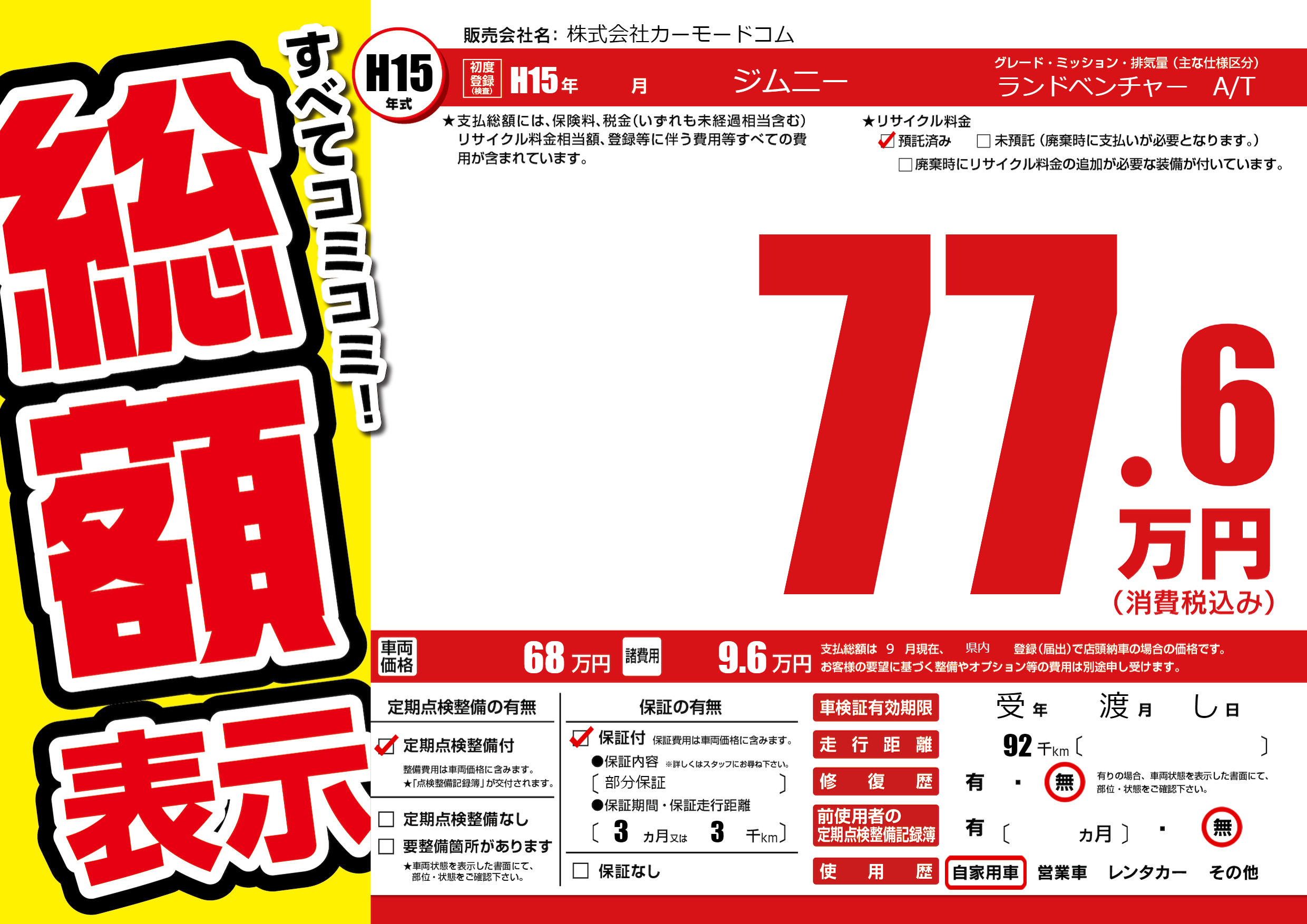| 車名 | ジムニー | グレード ミッション 排気量 |