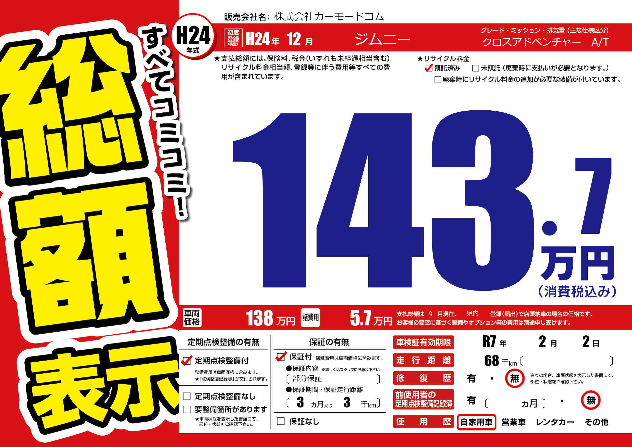 | 車名 | ジムニー | グレード ミッション 排気量 |