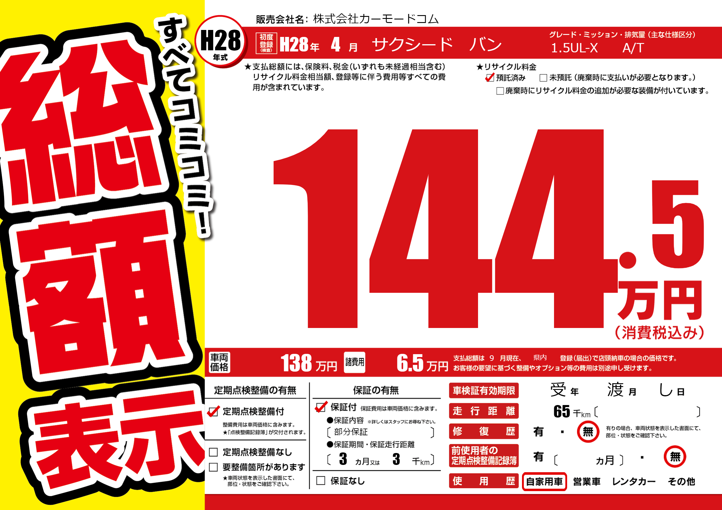 保証付き 保証内容(部分保証) 3ヶ月または(3)千kmまで |