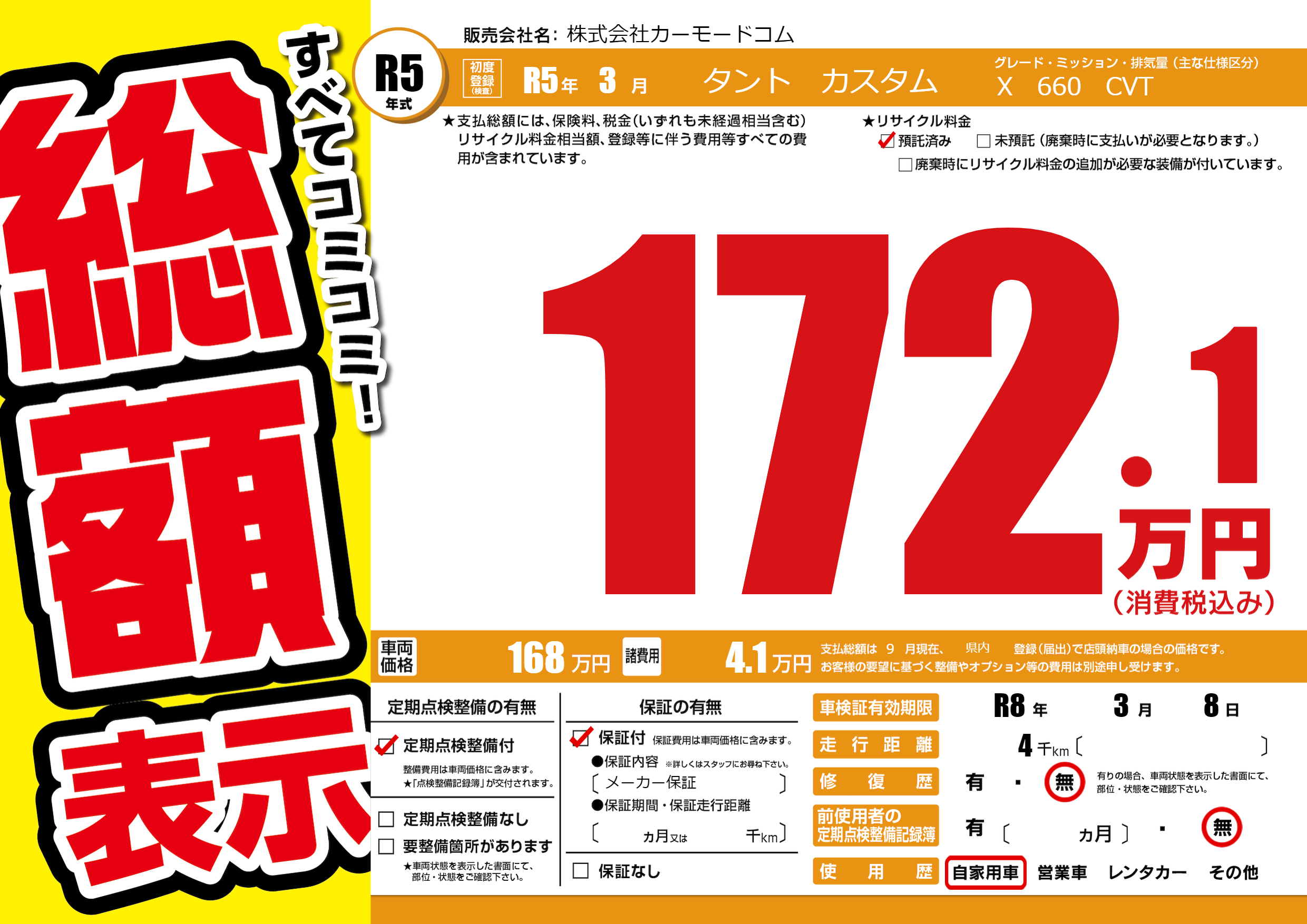 | 車名 | タント カスタム | グレード ミッション 排気量 |