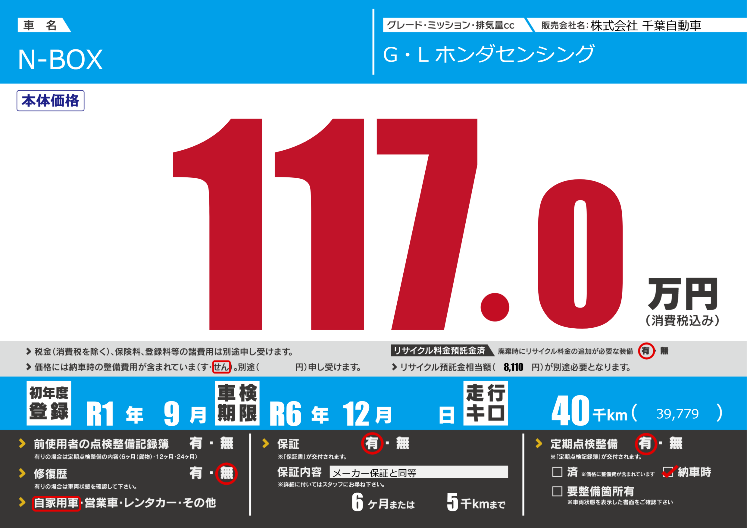 | 車名 | N-BOX | グレード ミッション 排気量 |