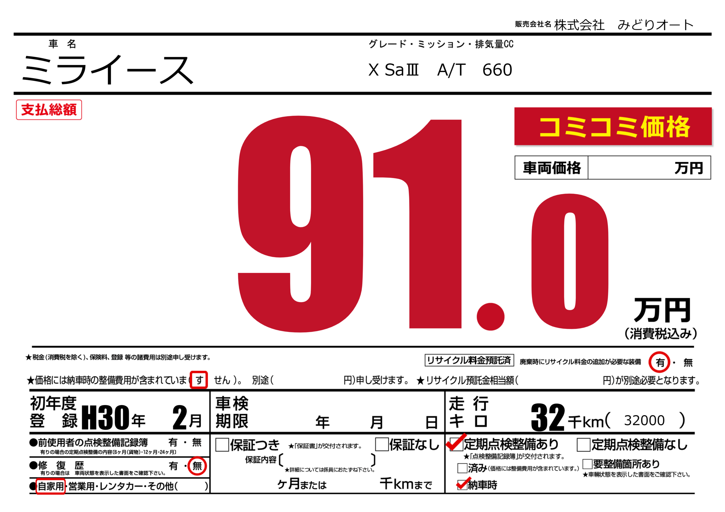 | 定期点検整備 | 定期点検整備あり 納車時あり | ||