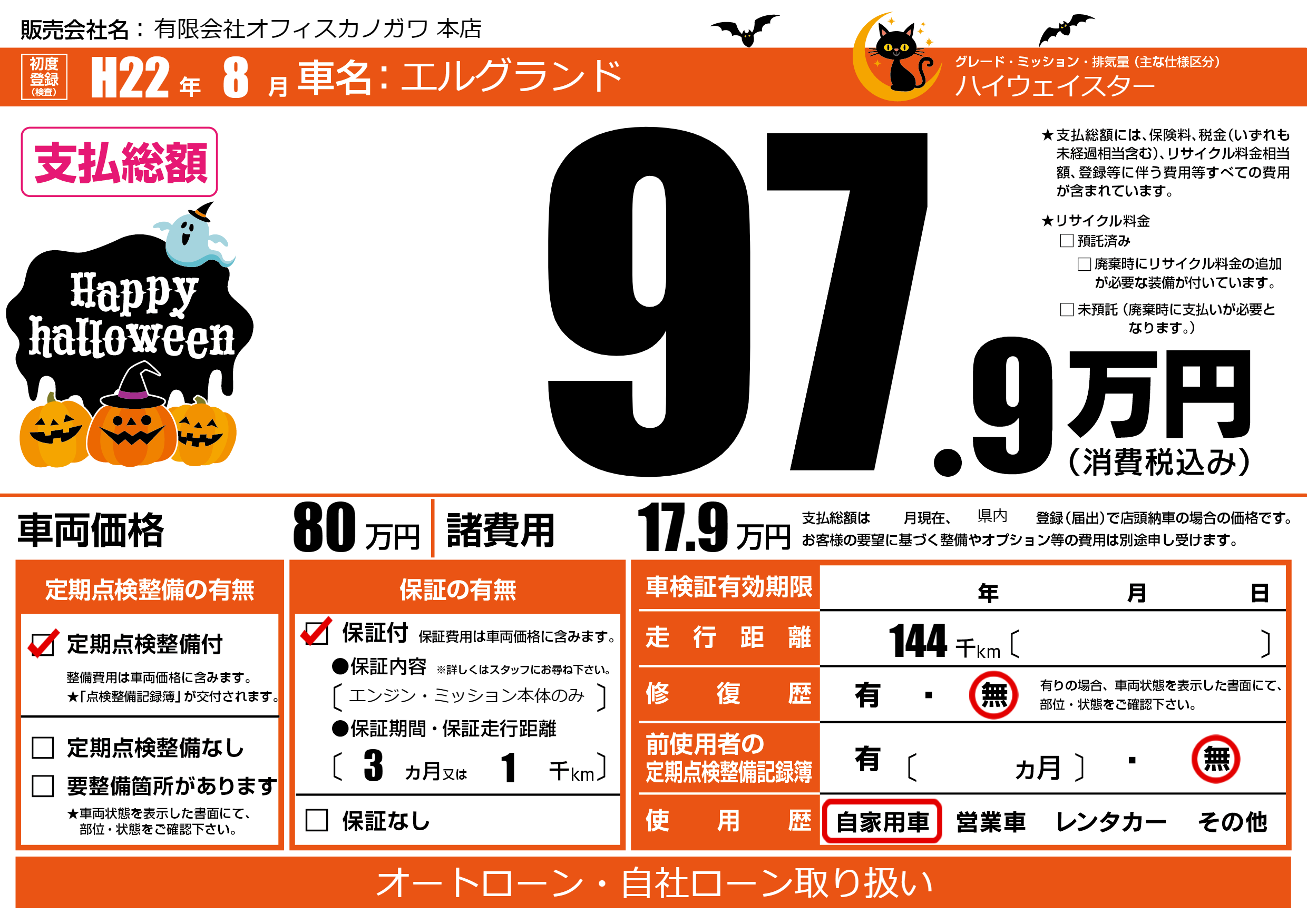 | 走行キロ | 14.4万km | 初年度登録 | H22年8月 |