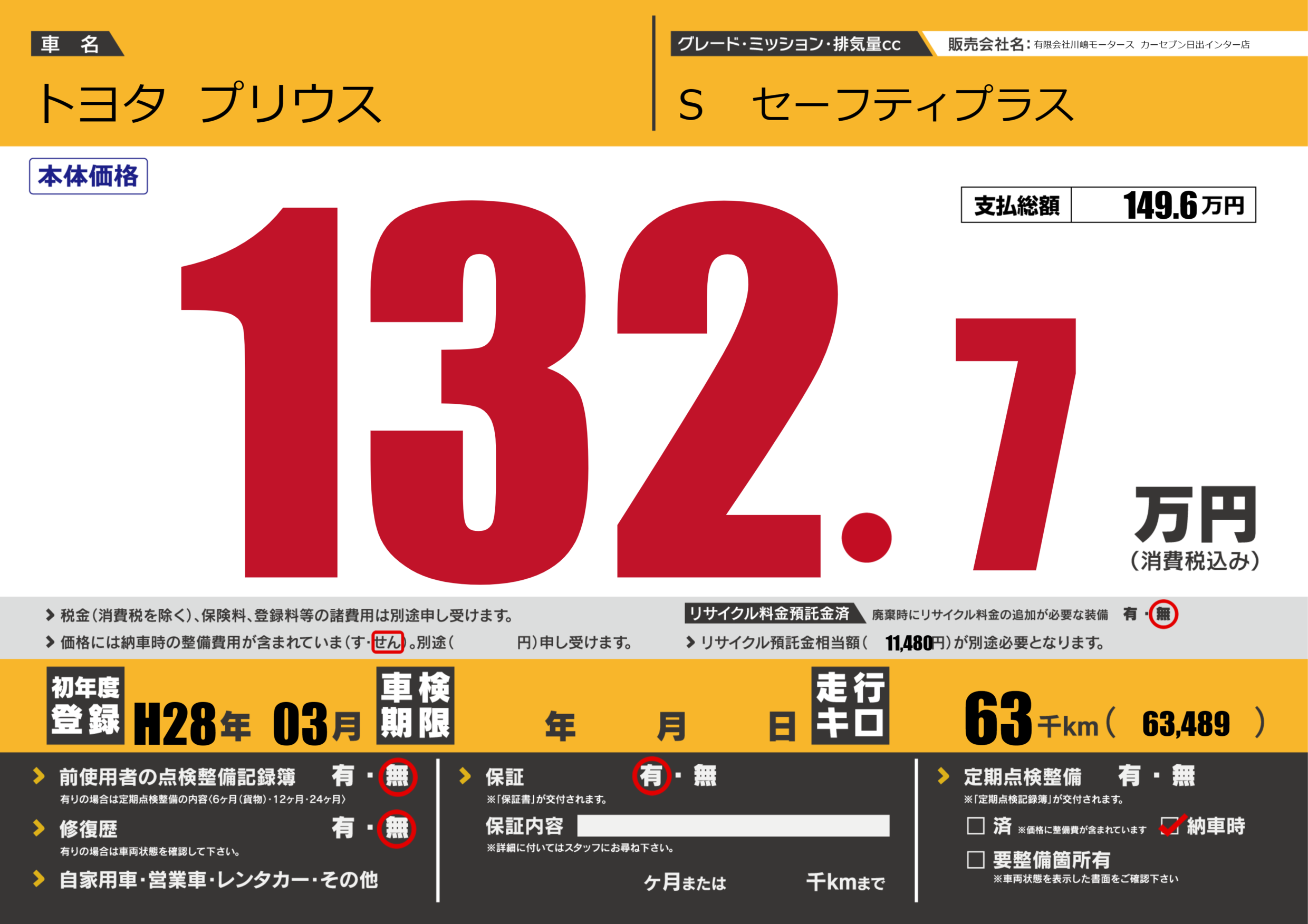 | 車名 | トヨタ プリウス | グレード ミッション 排気量 |