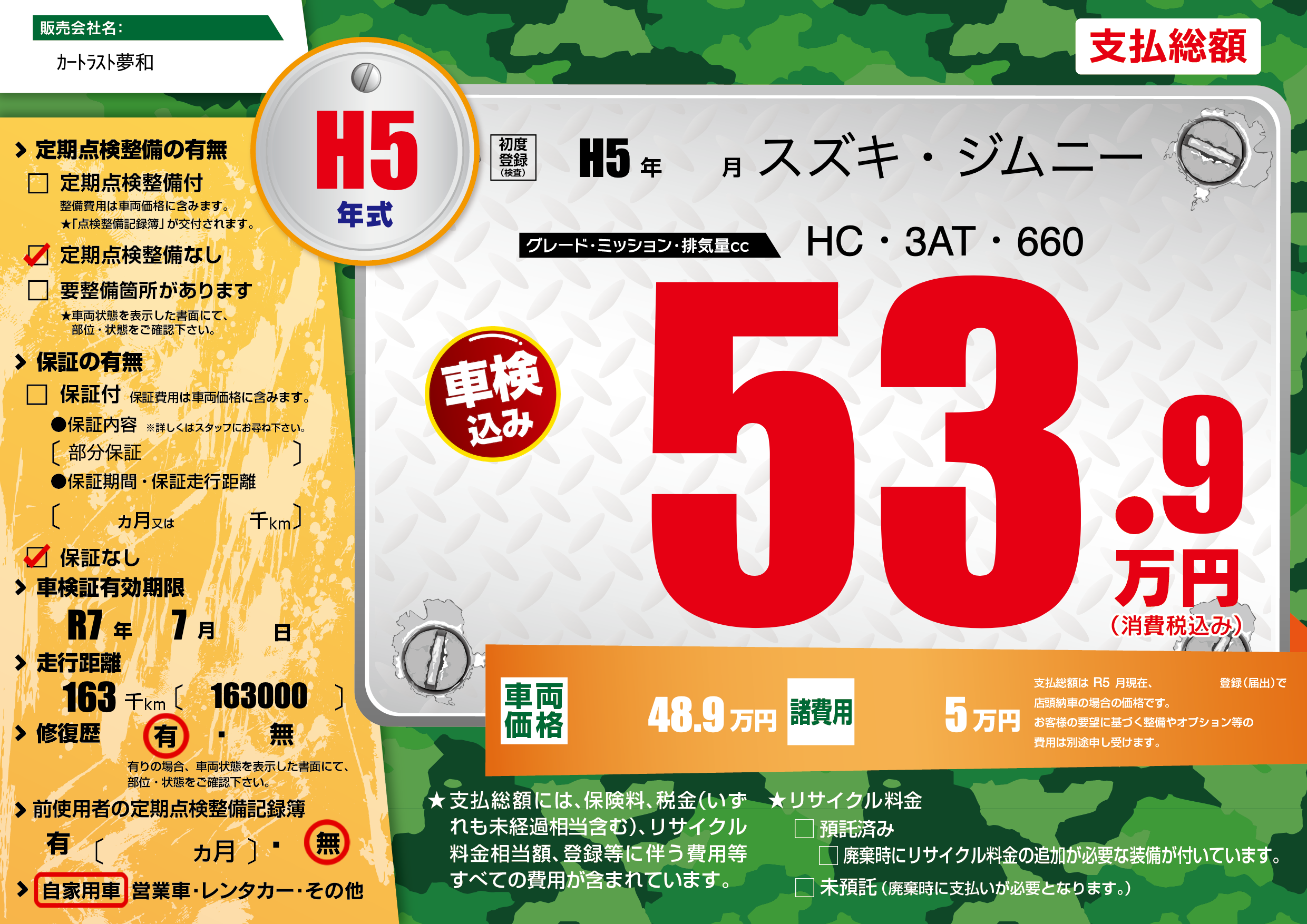 なし | 車検制限 | R7年7月---月 |