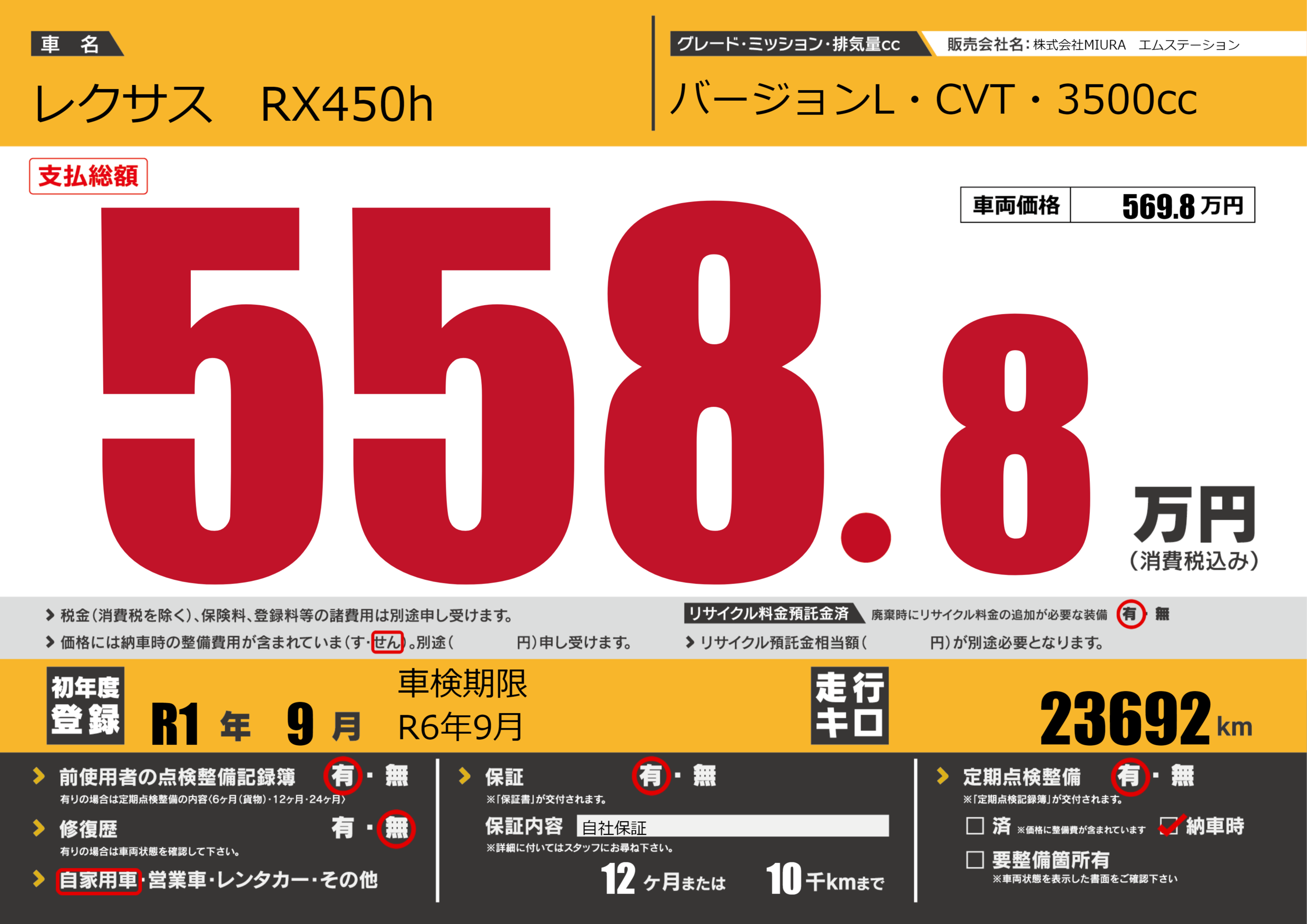| 車名 | レクサス RX450h | グレード ミッション 排気量 |