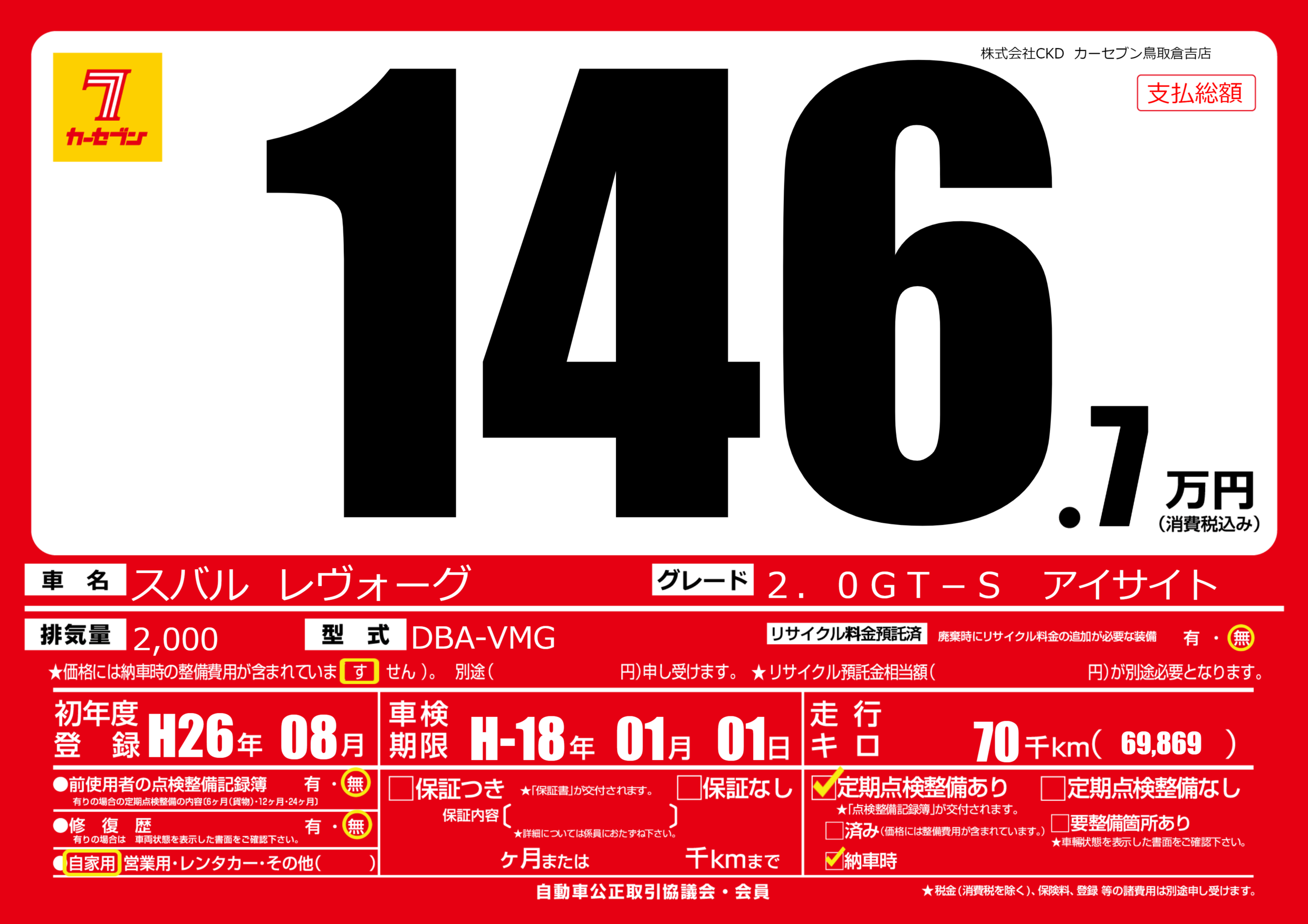 | 車名 | スバル レヴォーグ | グレード ミッション 排気量 |