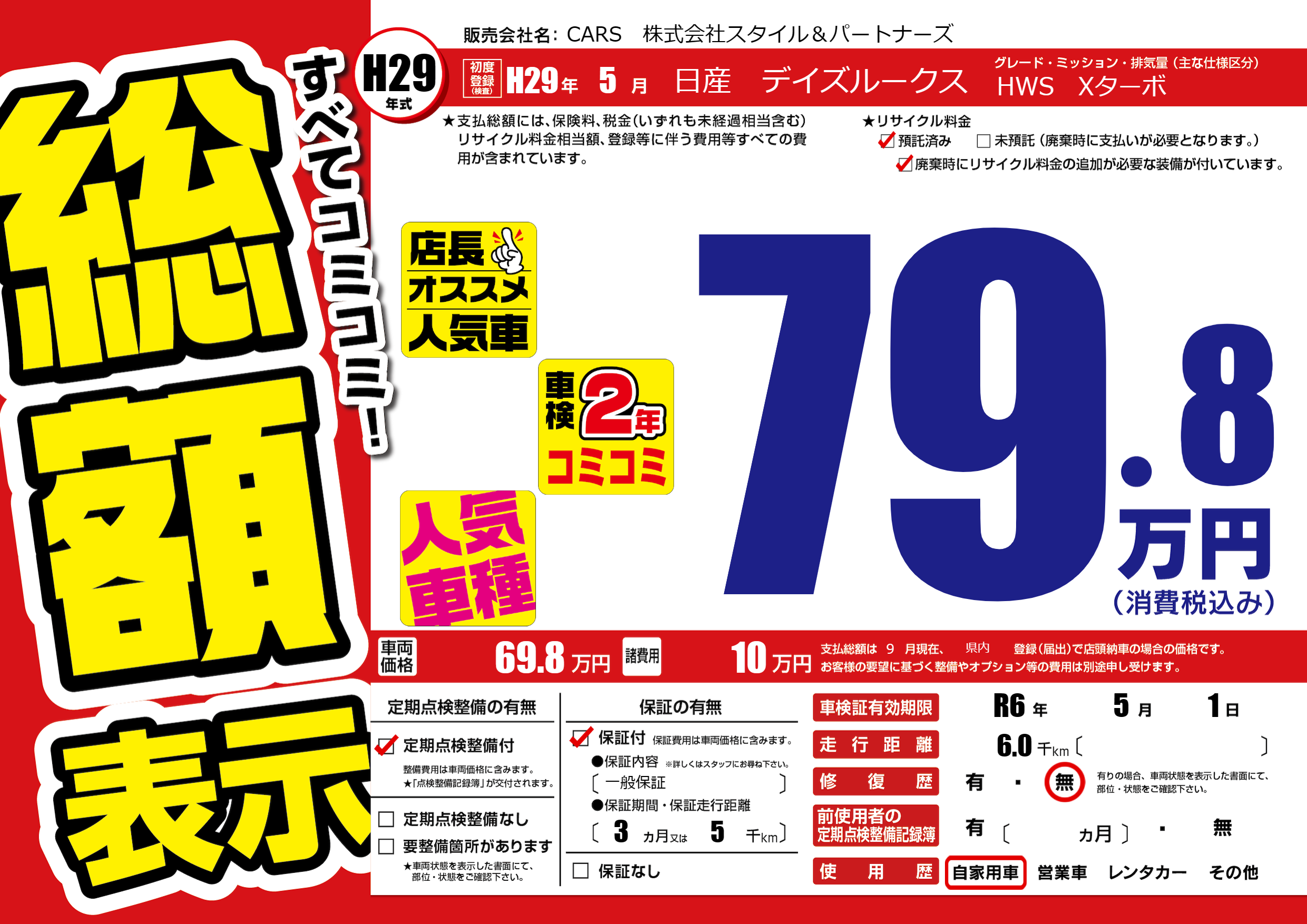 | 車名 | 日産 デイズルークス | グレード ミッション 排気量 |