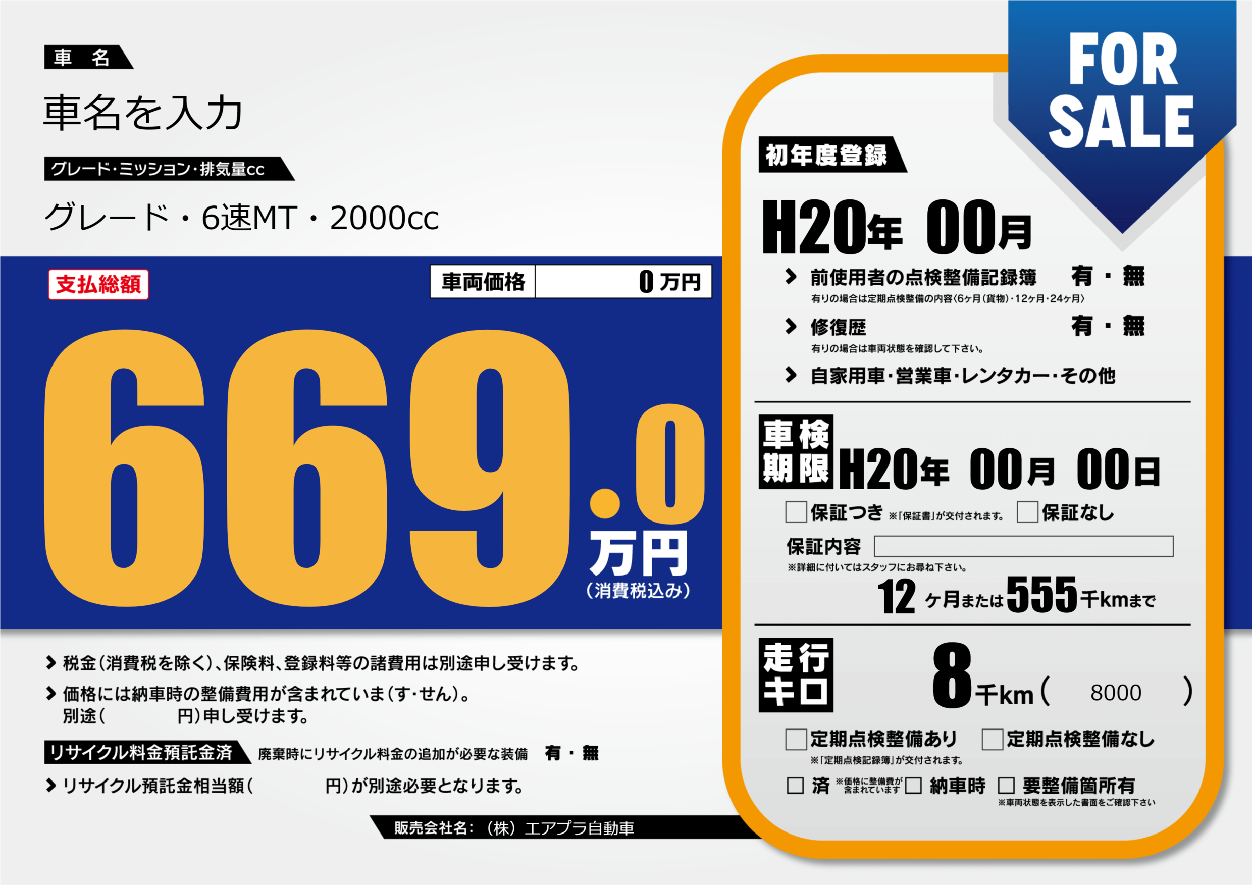 | 車検制限 | H20年 00月 00日 | ||