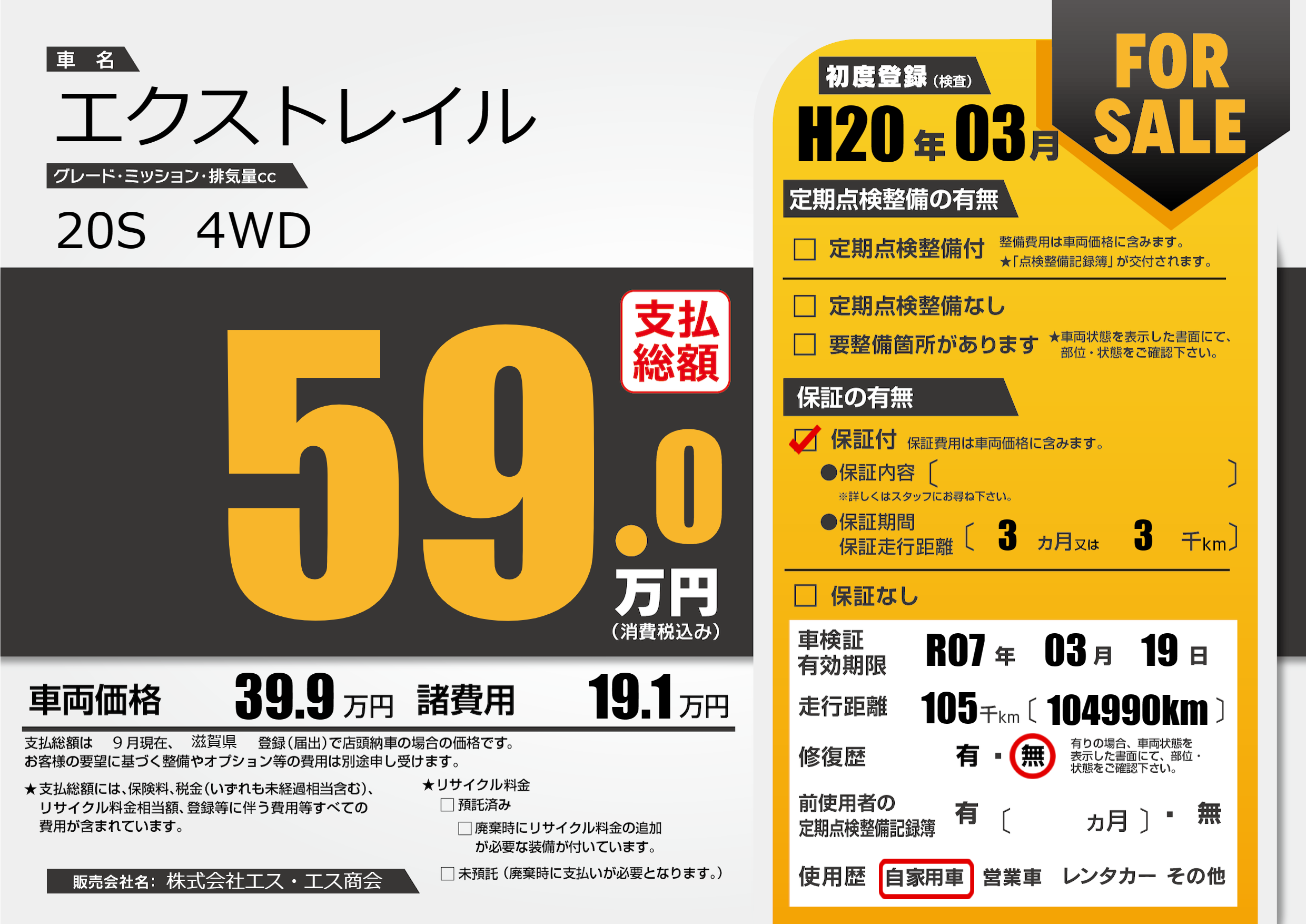 | 走行キロ | 10.5万km | 初年度登録 | H20年03月 |
