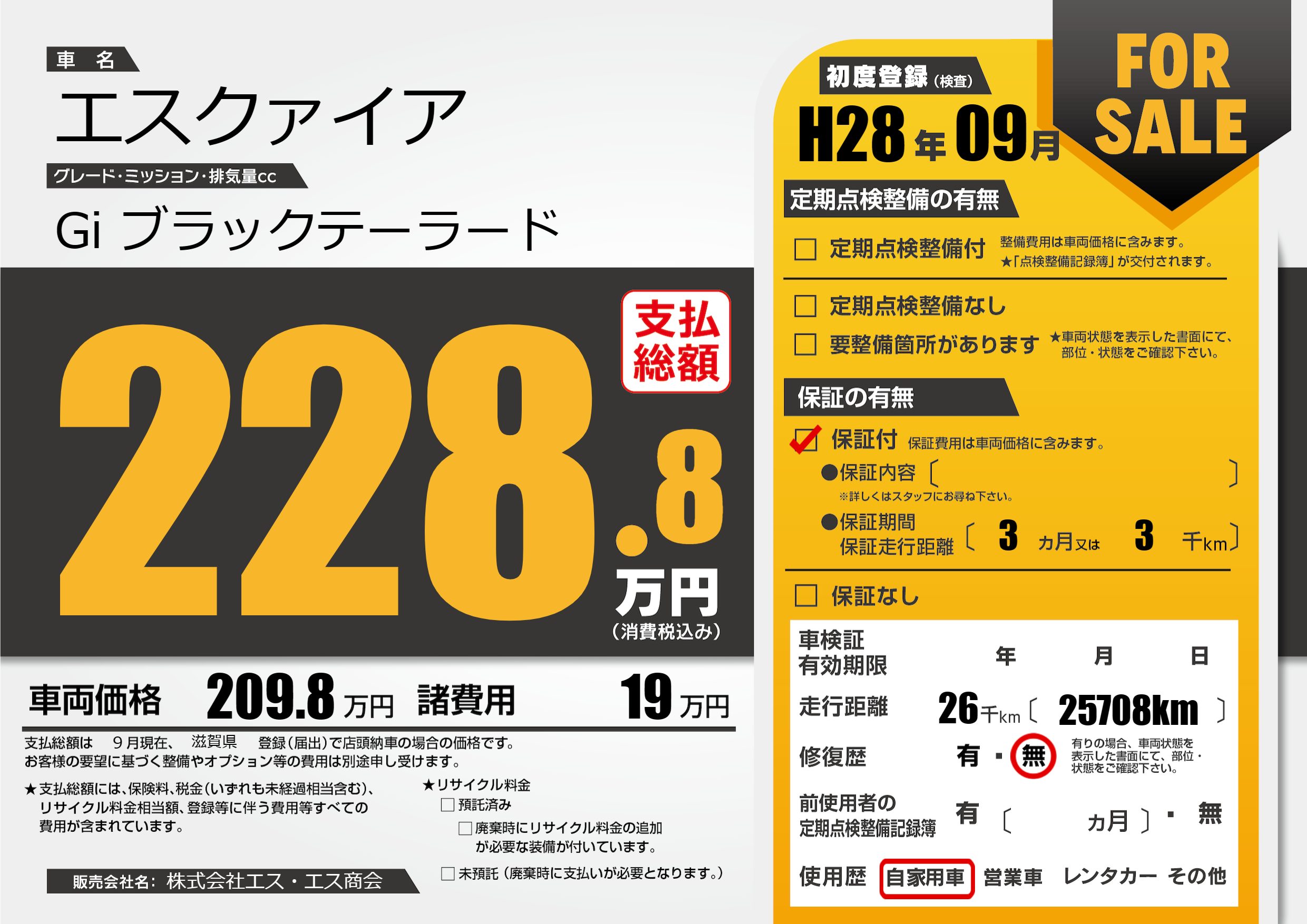 | 車名 | エスクァイア | グレード ミッション 排気量 |