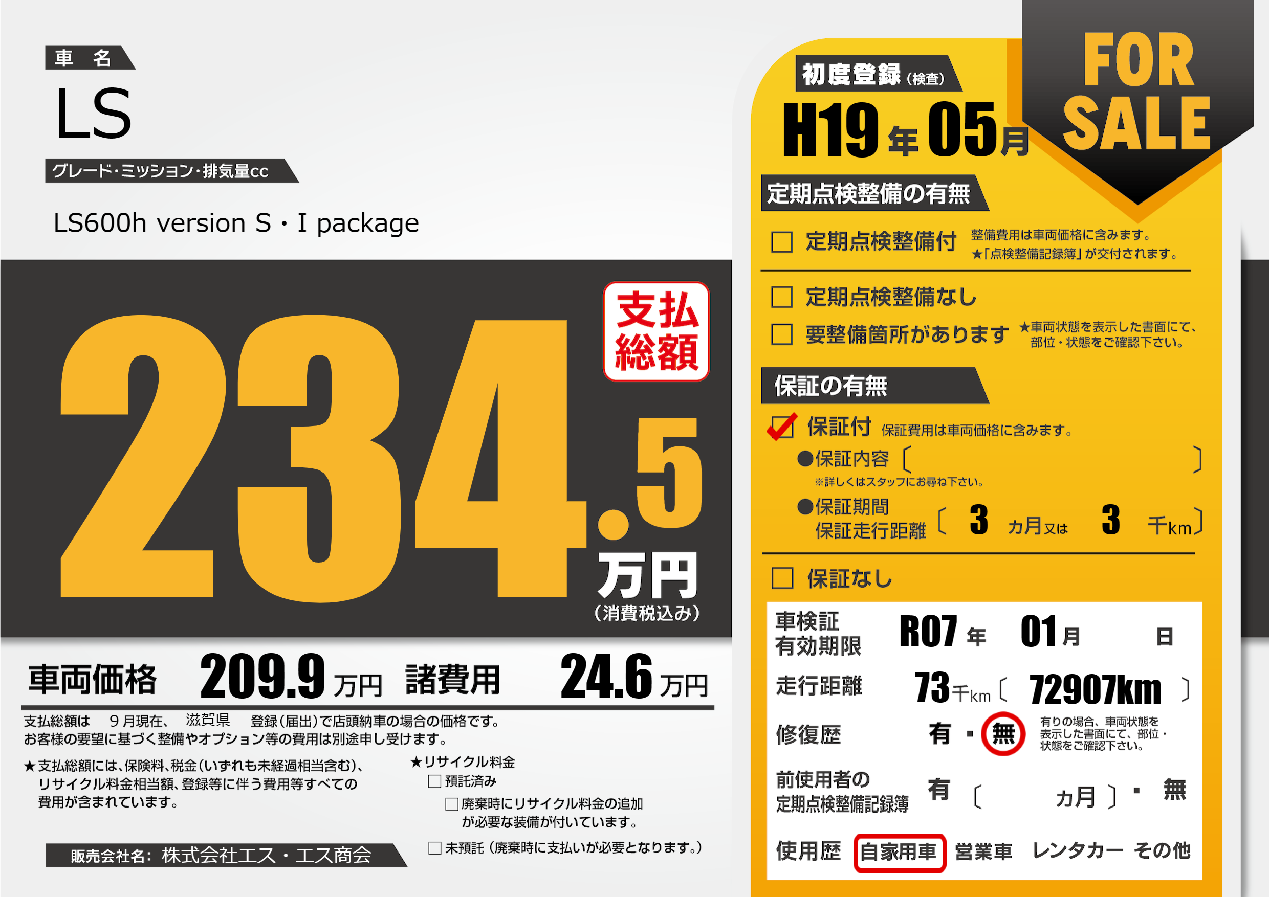| 走行キロ | 7.3万km | 初年度登録 | H19年05月 |