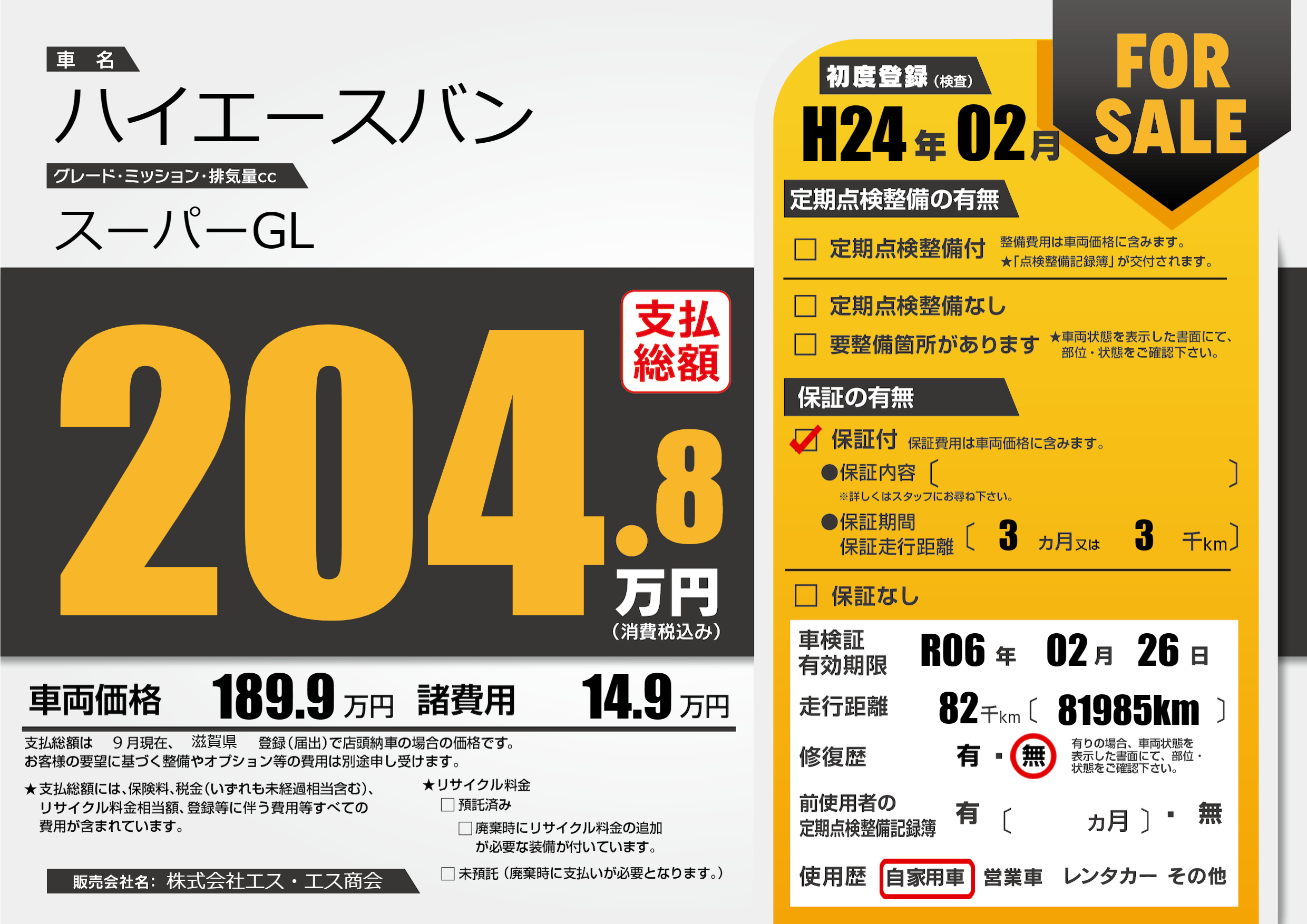 | 車名 | ハイエースバン | グレード ミッション 排気量 |