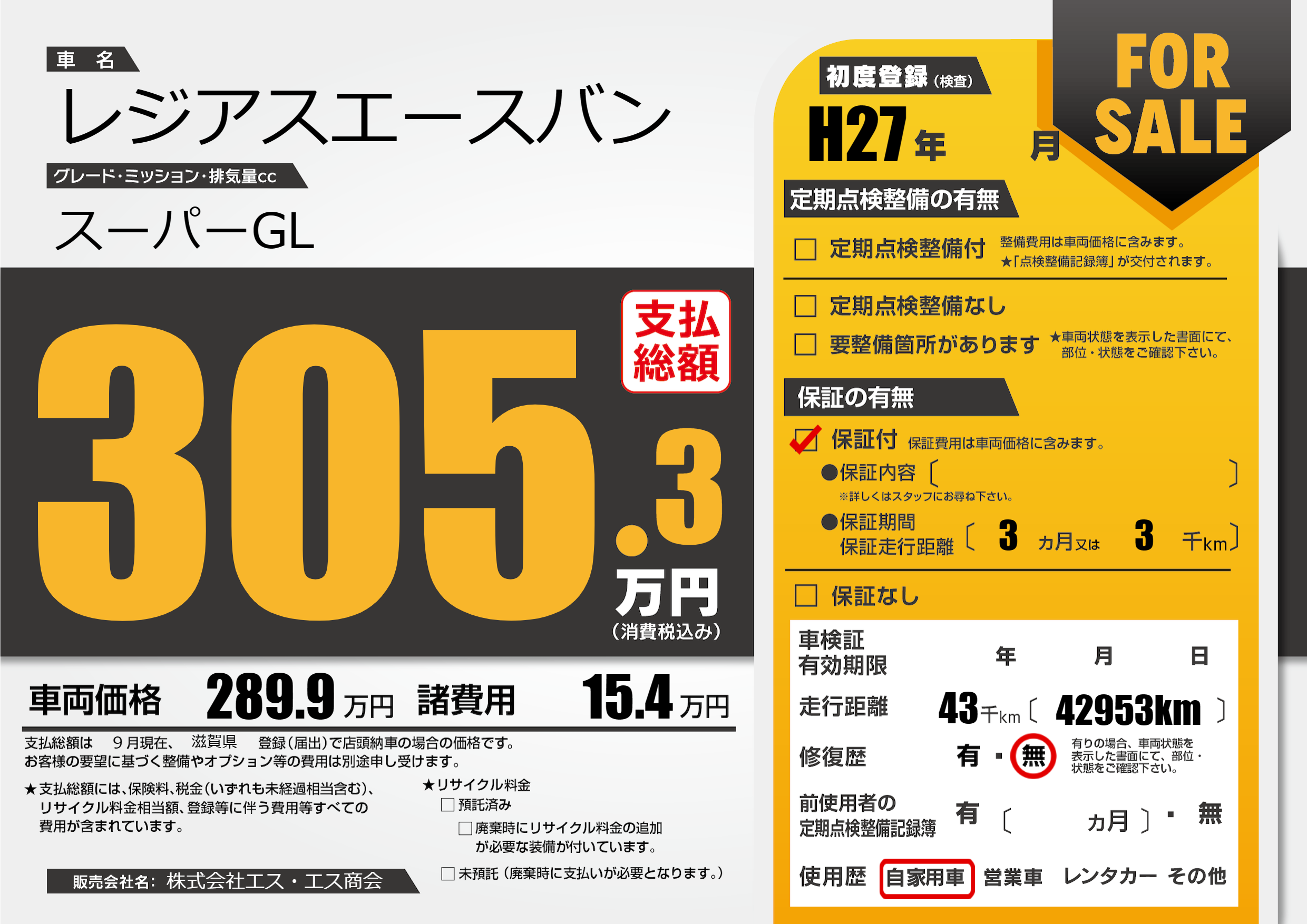 | 走行キロ | 4.3万km | 初年度登録 | H27年---月 |
