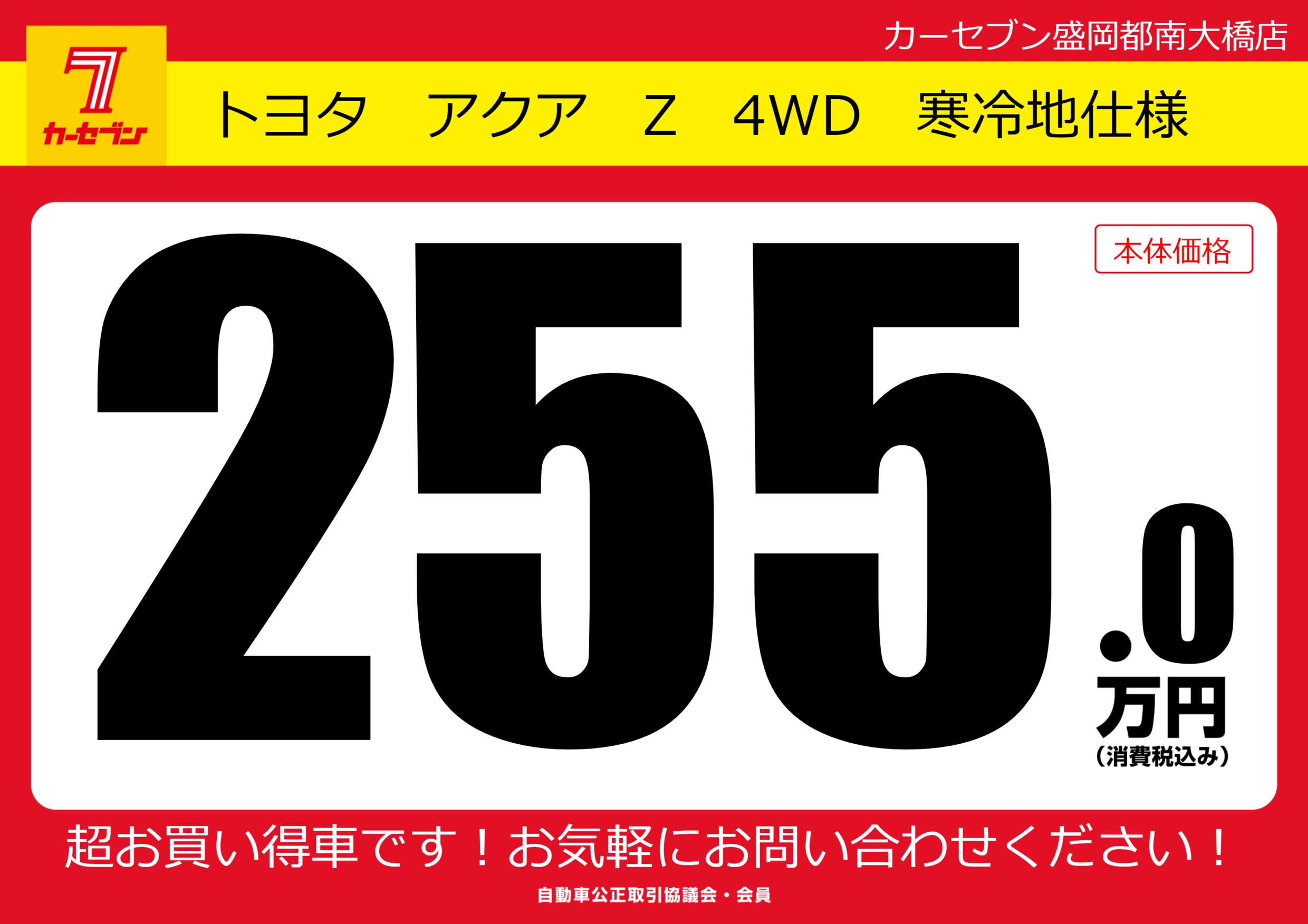 | 車名 | トヨタ アクア Z 4WD 寒冷地仕様 | グレード ミッション 排気量 |