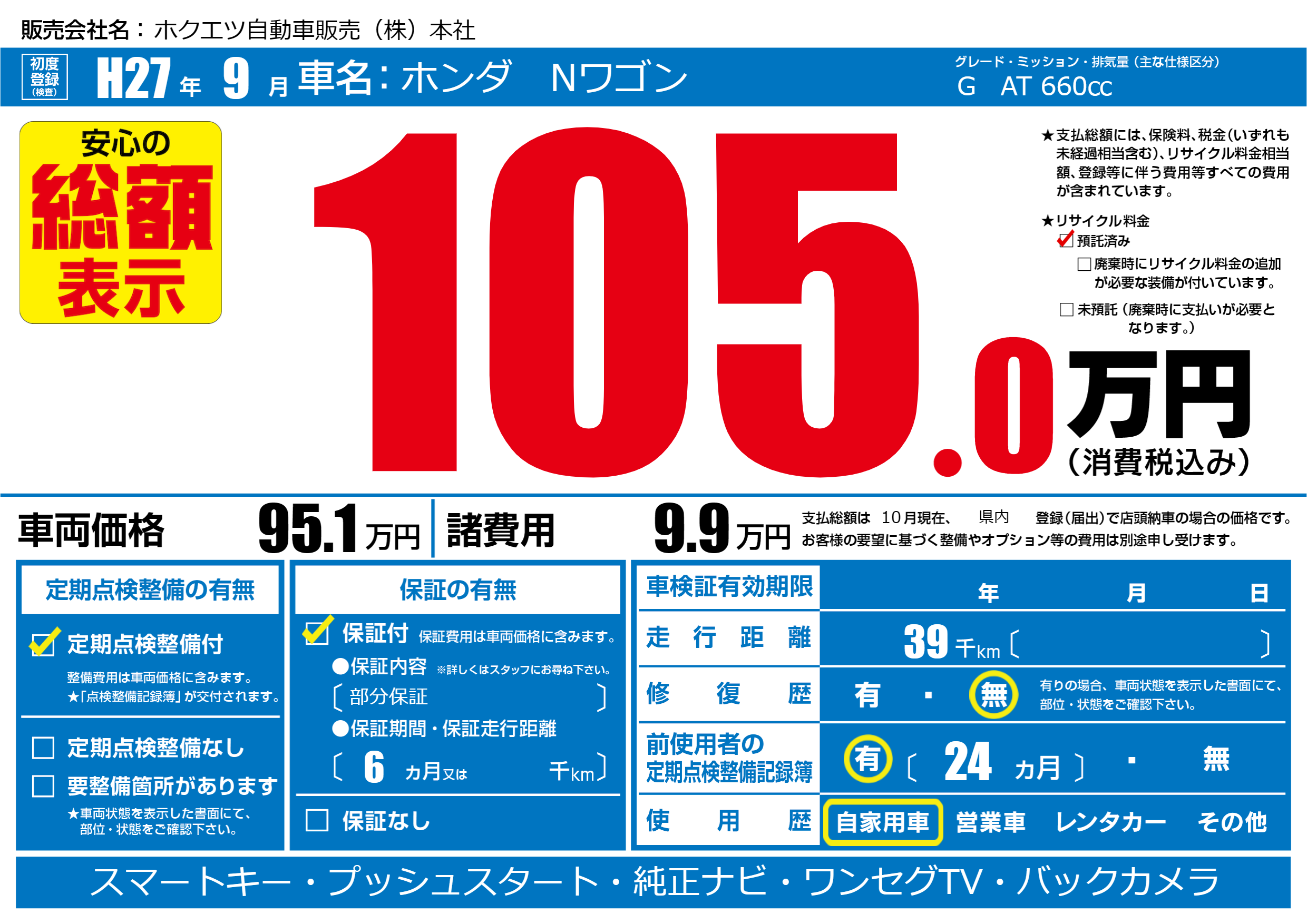 | 走行キロ | 3.9万km | 初年度登録 | H27年9月 |