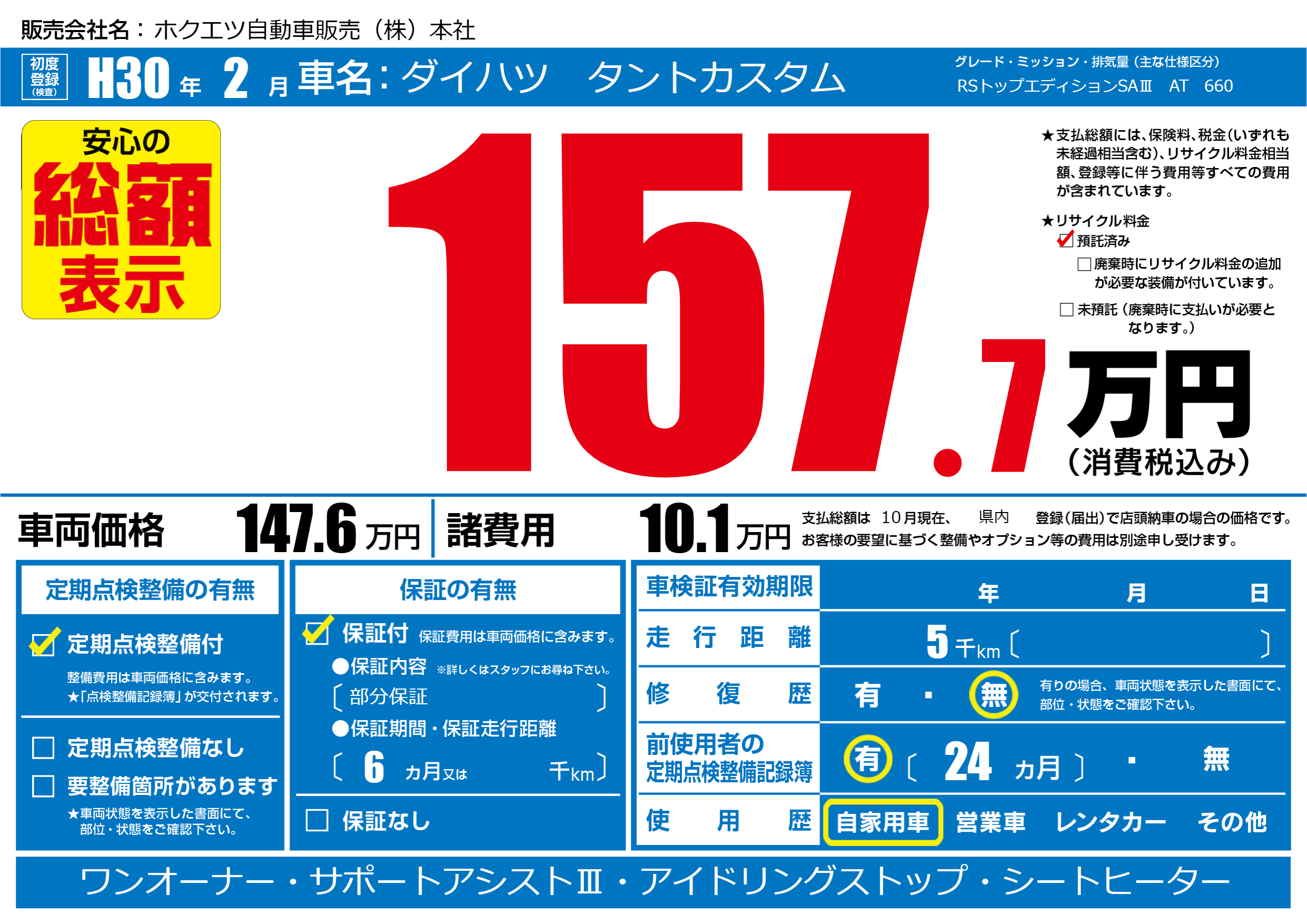 | 走行キロ | 0.5万km | 初年度登録 | H30年2月 |