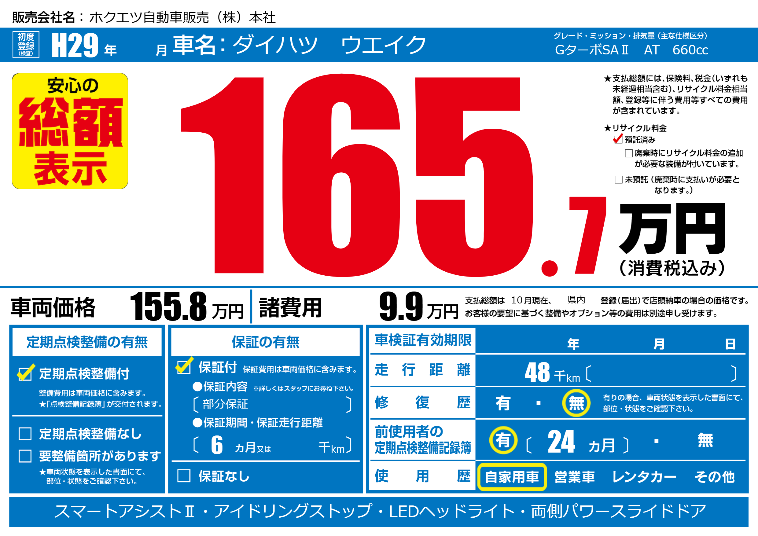 | 走行キロ | 4.8万km | 初年度登録 | H29年---月 |