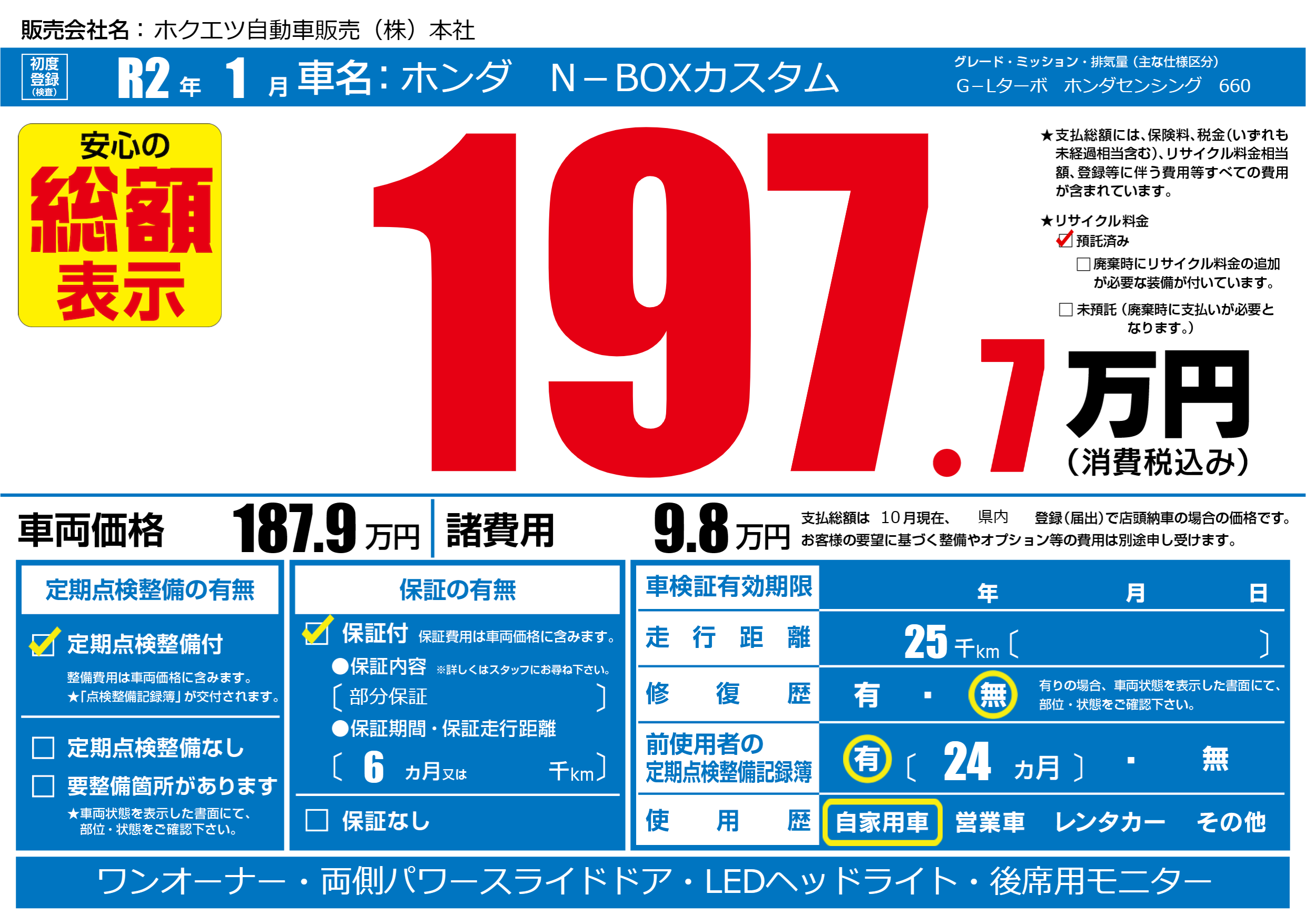 | 車名 | ホンダ N-BOXカスタム | グレード ミッション 排気量 |
