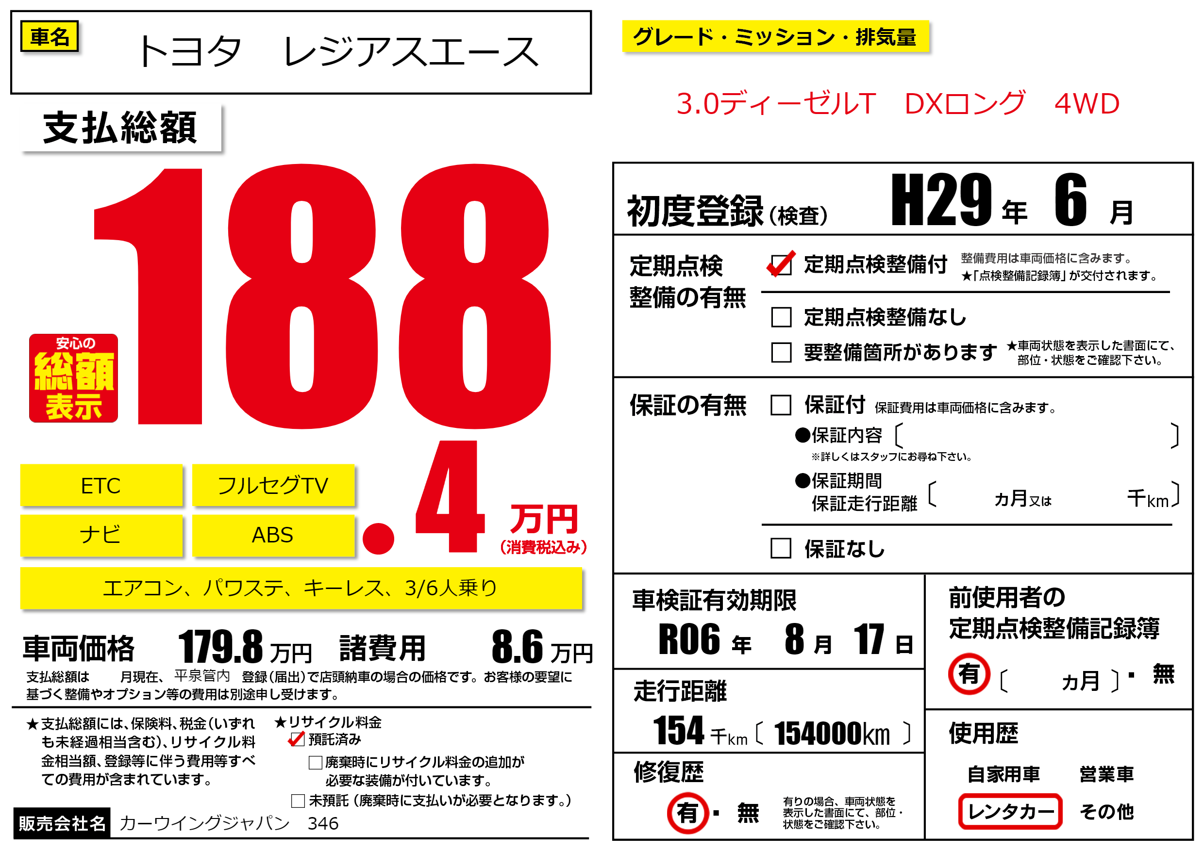 | 車名 | トヨタ レジアスエース | グレード ミッション 排気量 |