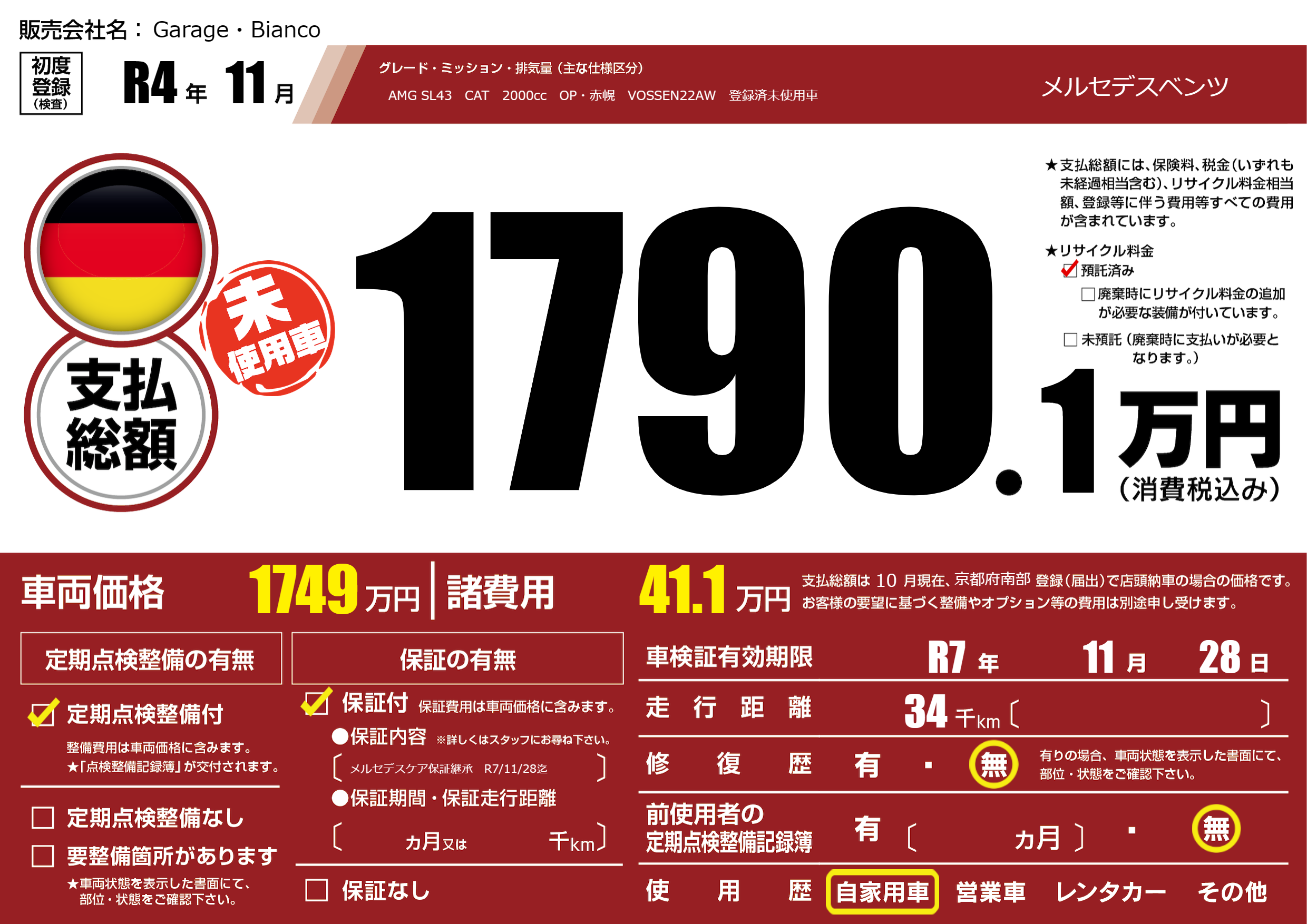 保証付き 保証内容(メルセデスケア保証継承 R7/11/28迄) ---ヶ月または()千kmまで |