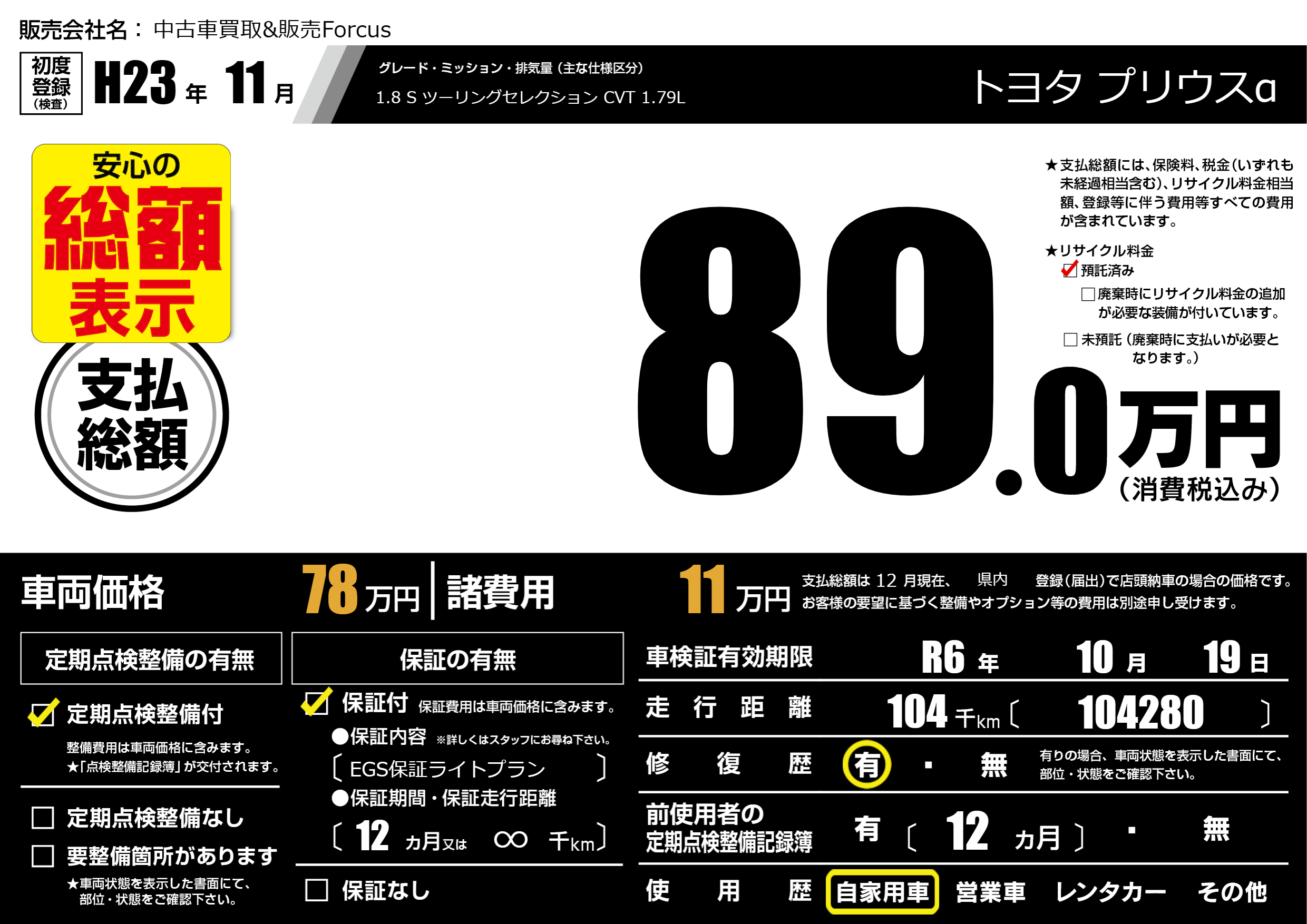 なし | 車検制限 | R6年10月19月 |